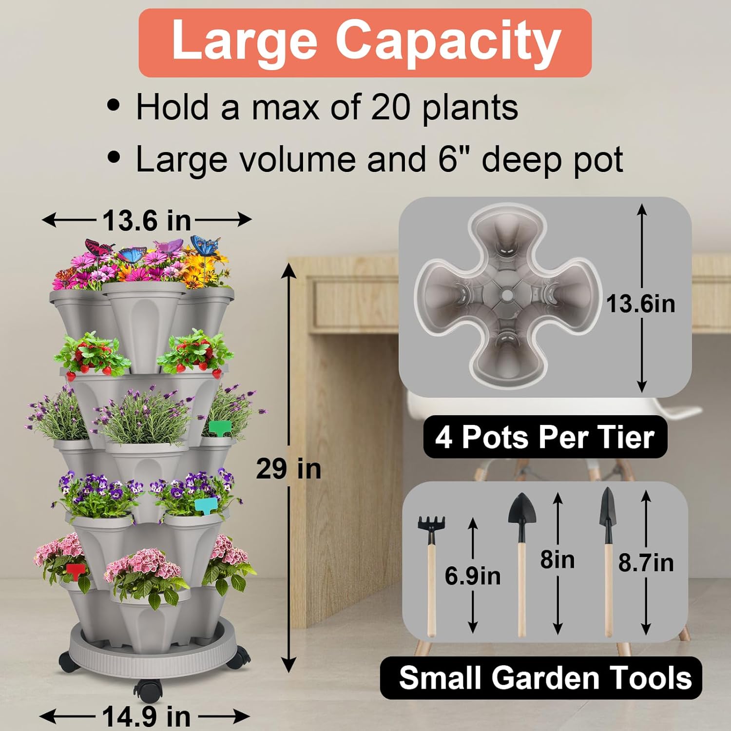 DUNCHATY Stackable Planter, Vertical Strawberry Planter with Garen Tool Set, Self Watering Garden Planter Indoor/Outdoor 5 Tier Herb Planter Pots for Growing Vegetables and Succulents, Gray