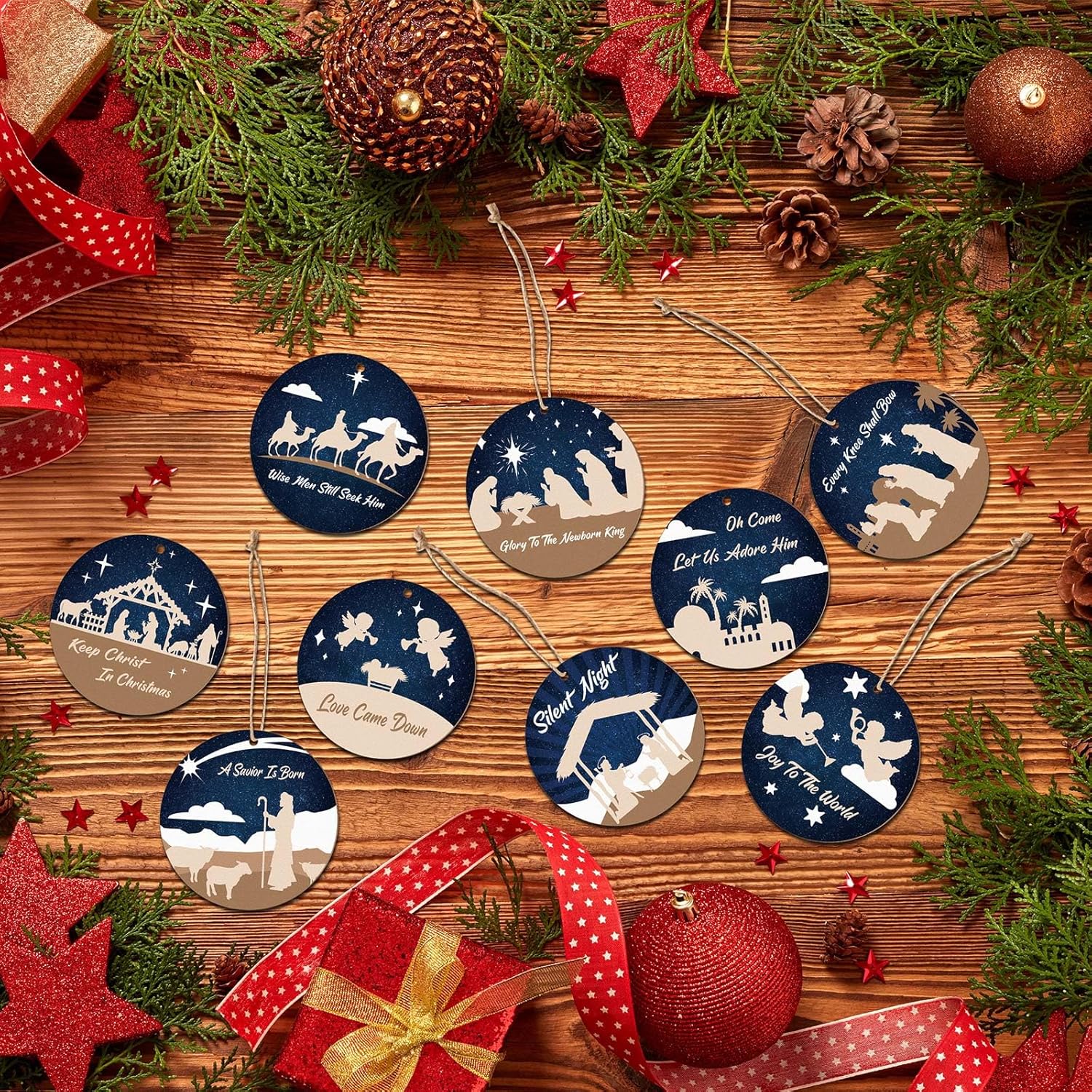 • Size Information: each religious ornament measures about 3 x 3 x 0.1 inch, a proper size that suits different Christmas themes; Whether you choose to display them on your Christmas tree, mantle, or wall, these ornaments will effortlessly fit into your holiday setting without overwhelming the scene