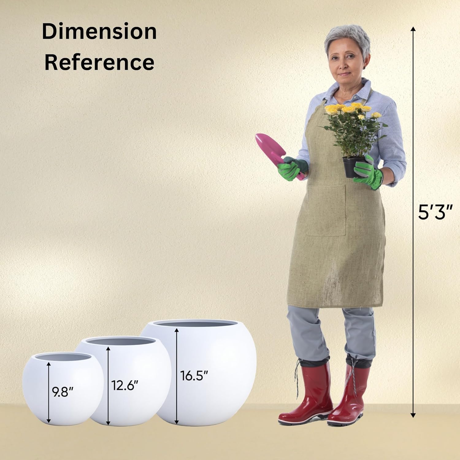 • PRODUCT DIMENSIONS: Carefully review the planter dimensions, especially the pot opening, to ensure they meet the needs of your project. Proper sizing is essential for accommodating your plants and achieving the desired aesthetic and functionality. SMALL PLANTER MEASURES: 10-inch height x 13-inch diameter, pot opening 8 inches MEDIUM PLANTER MEASURES: 13.5-inch height x 17-inch diameter, pot opening 12 inches LARGE PLANTER MEASURES: 17-inch height x 21-inch diameter, pot opening 14.4 inches