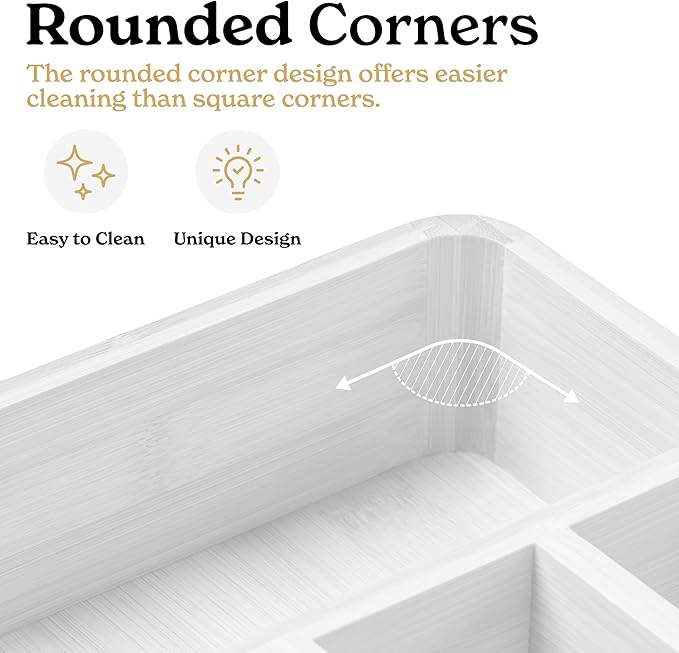 • A Purchase You'll Feel Great About - Made from sustainable bamboo, our bamboo drawer organizer is durable and easy to clean with rounded corners. This silverware holder is eco-friendly, user-friendly, and keeps your kitchen stylishly organized.