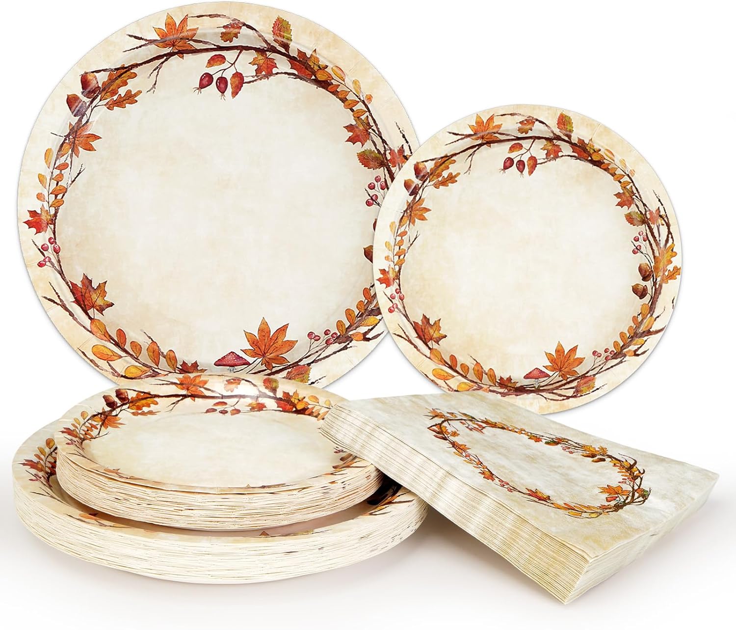 • FALL & THANKSGIVING DECORATIONS: Autumn and Thanksgiving are on the way, so make some preparations for their arrival. This vintage autumn leaves wreath plates and napkins set will be the best table decoration for your fall party.