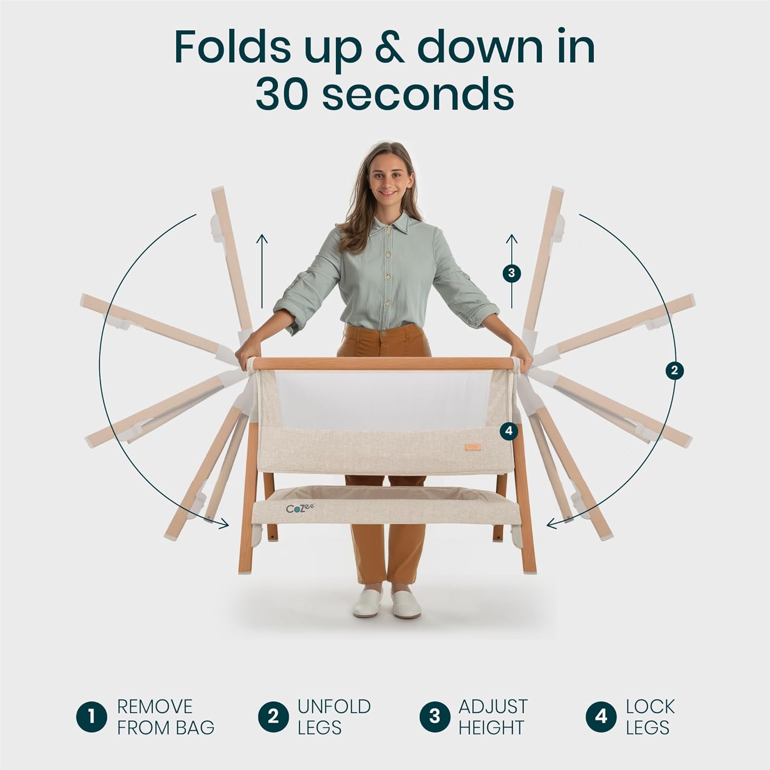 • SET UP IN 30 SECONDS - Thanks to our innovative fast-folding mechanism, the baby bedside bassinet is ultra quick to set up! The wood-effect legs lock securely into place to keep the bedside crib stable.