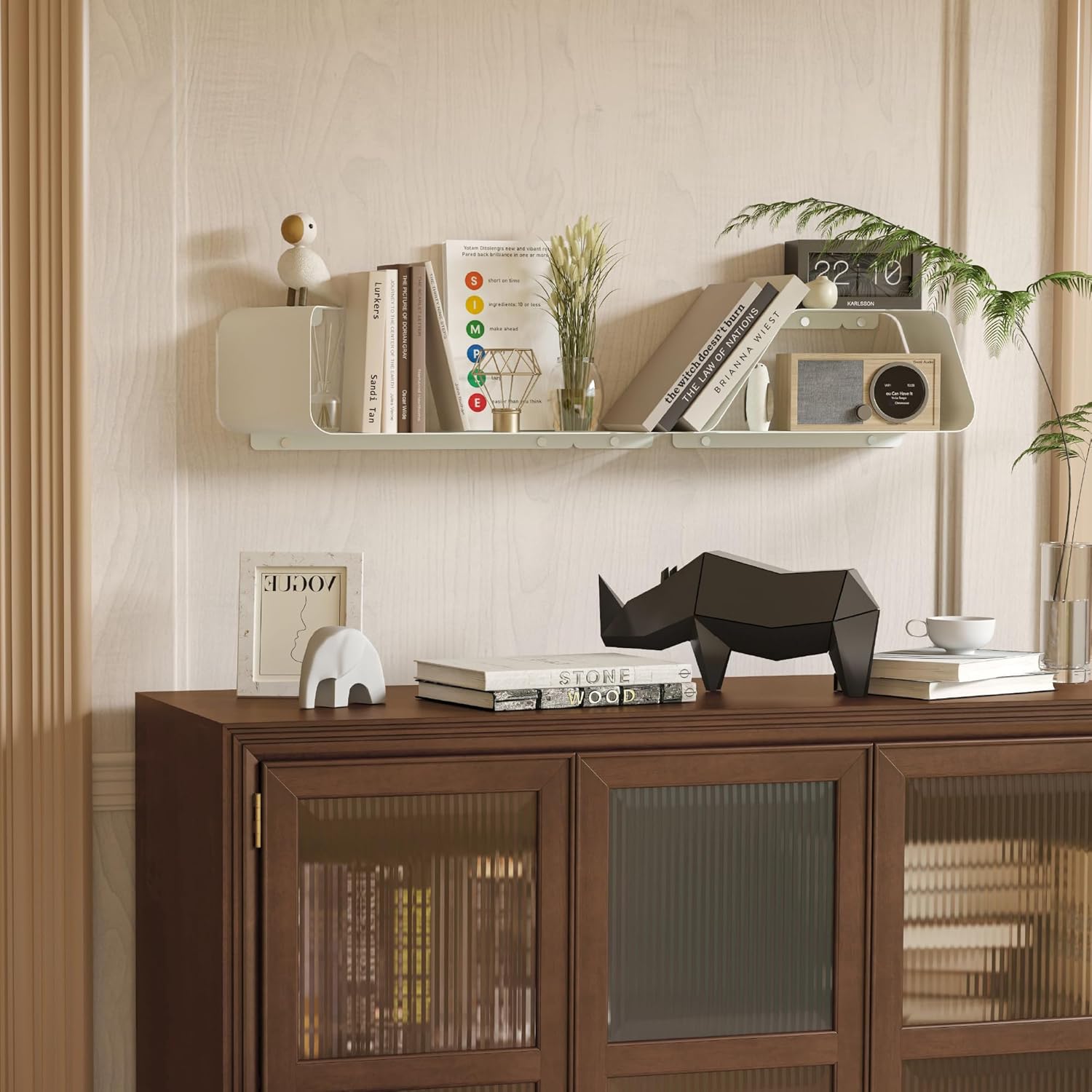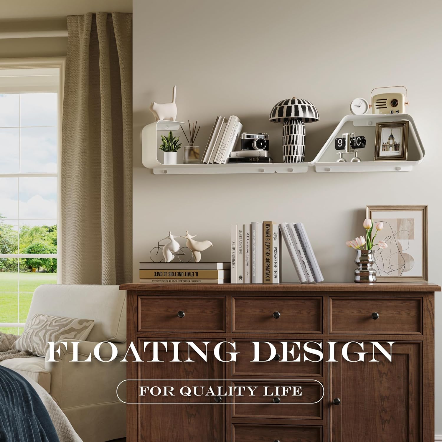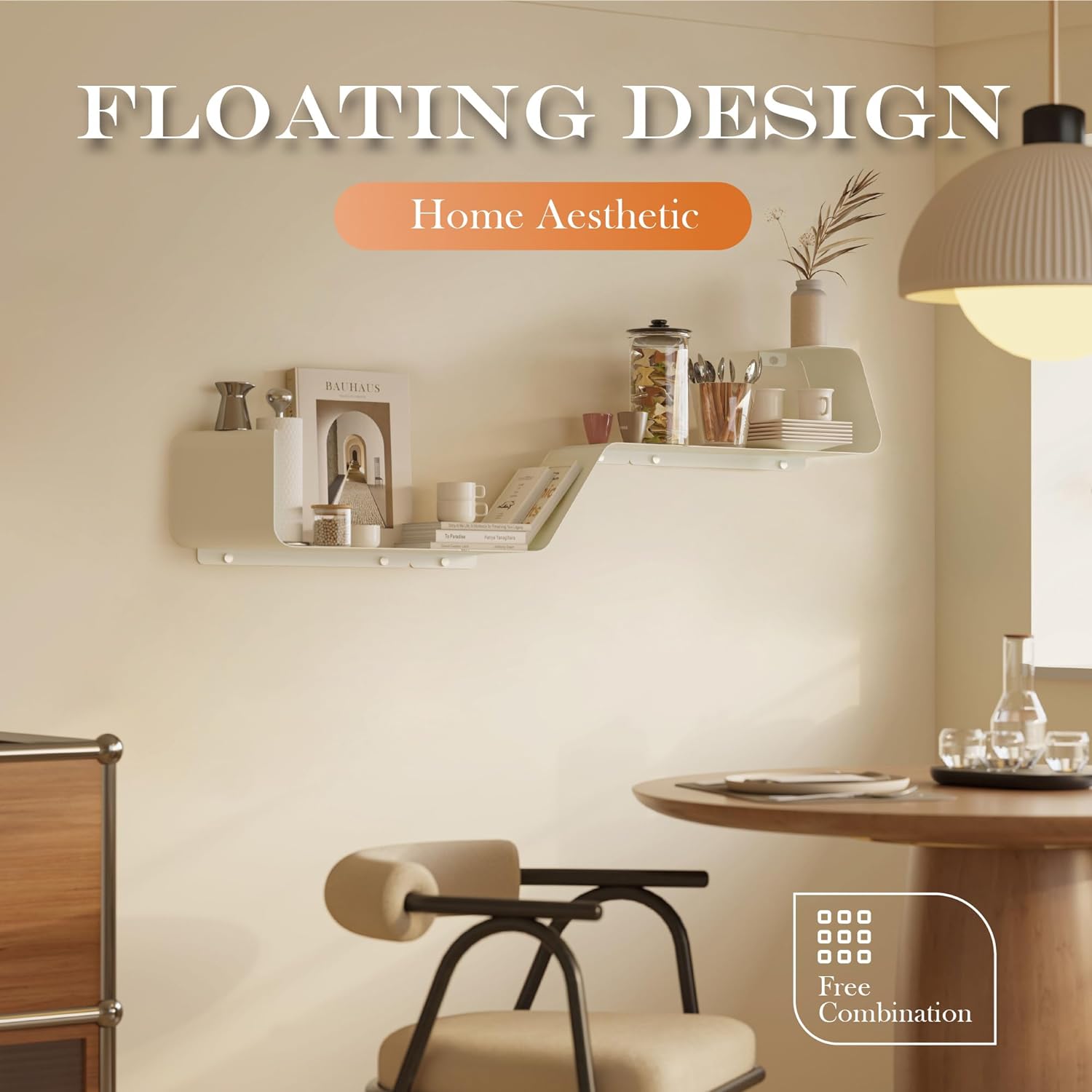 • Multifunctional Floating Shelf: This unique piece offers an inventive design flexible configuration to fit any size of wall space. Transform wasted wall space into a spacious storage area. These shelves, a bedroom showcase for prized items, a living room display for photos, a bathroom organizer for toiletries, or a kitchen rack for spices and so on. It doesn't just offer organization, it elevates your living space, redefining the aesthetic of your home.