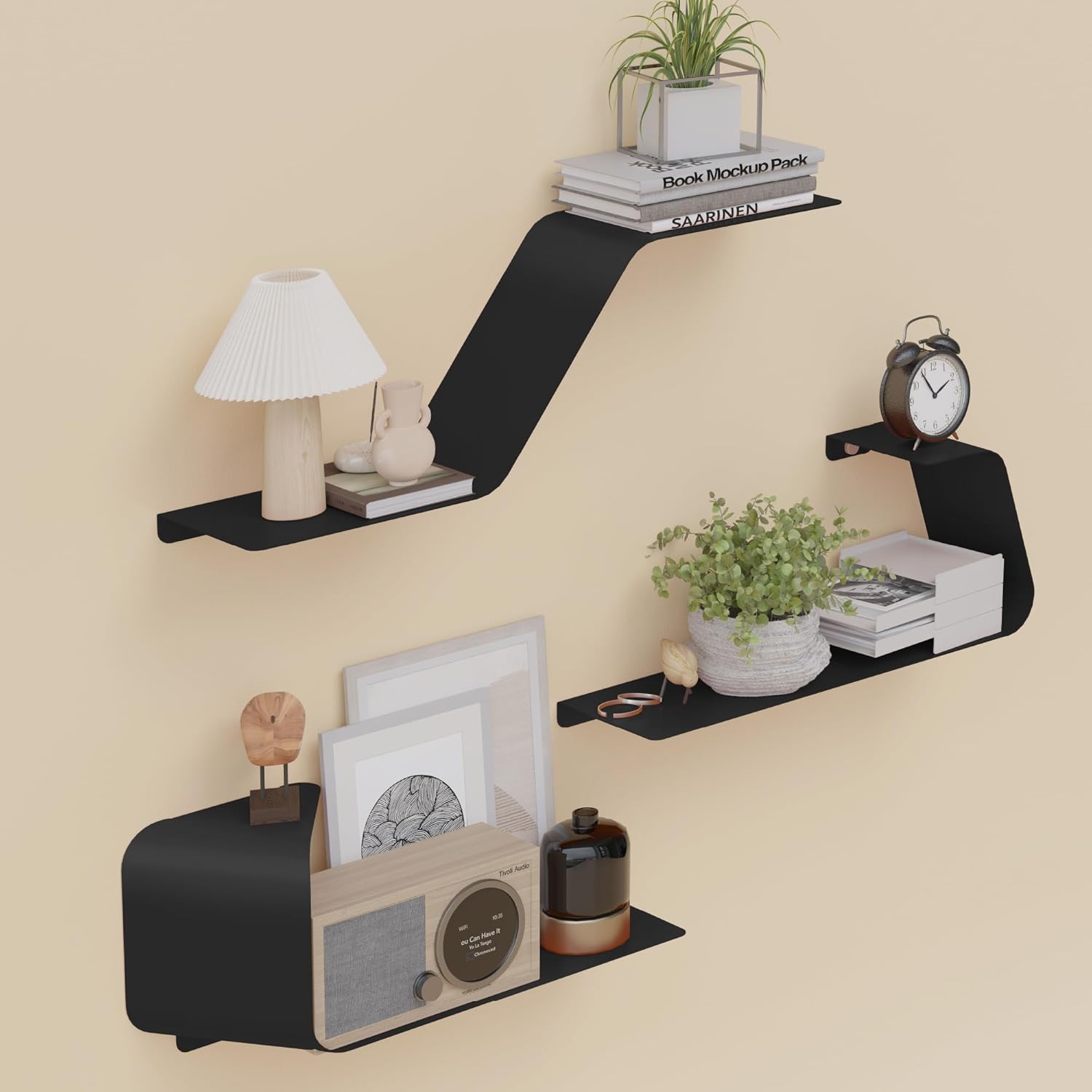 Floating Shelves, Wall Shelf, Set of 3 Wall Mounted Metal Shelves with Unique Design for Wall Storage, Book Shelf, Display Shelves for Bathroom Bedroom Kitchen Living Room for Home Black