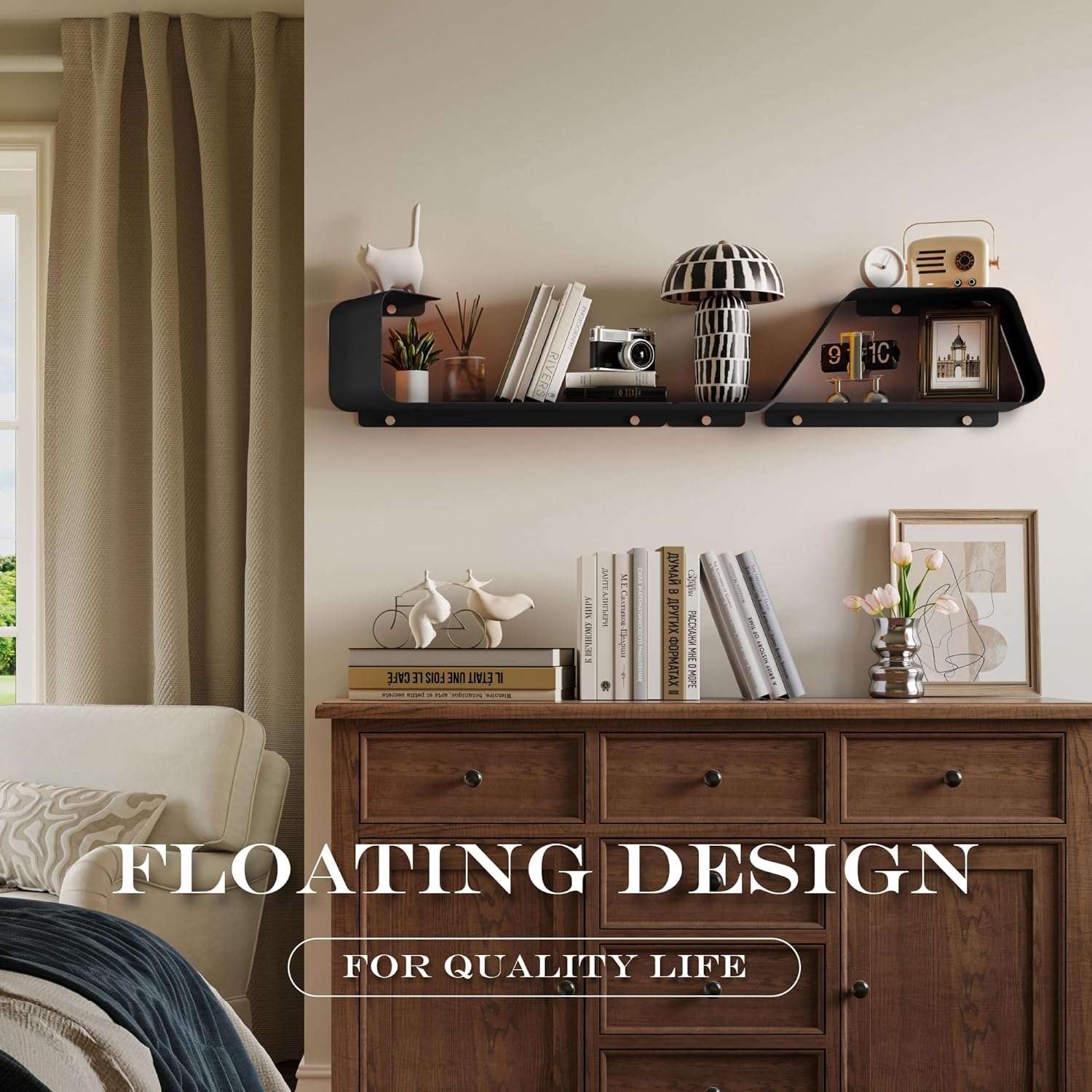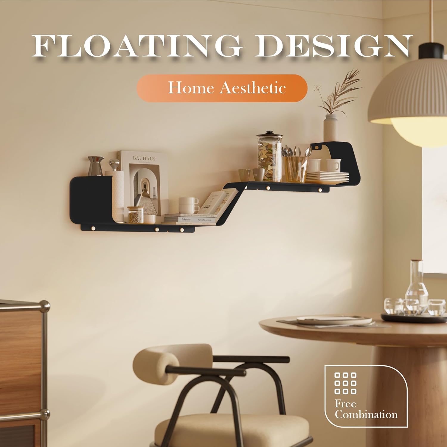 • Multifunctional Floating Shelf: This unique piece offers an inventive design flexible configuration to fit any size of wall space. Transform wasted wall space into a spacious storage area. These shelves, a bedroom showcase for prized items, a living room display for photos, a bathroom organizer for toiletries, or a kitchen rack for spices and so on. It doesn't just offer organization, it elevates your living space, redefining the aesthetic of your home.