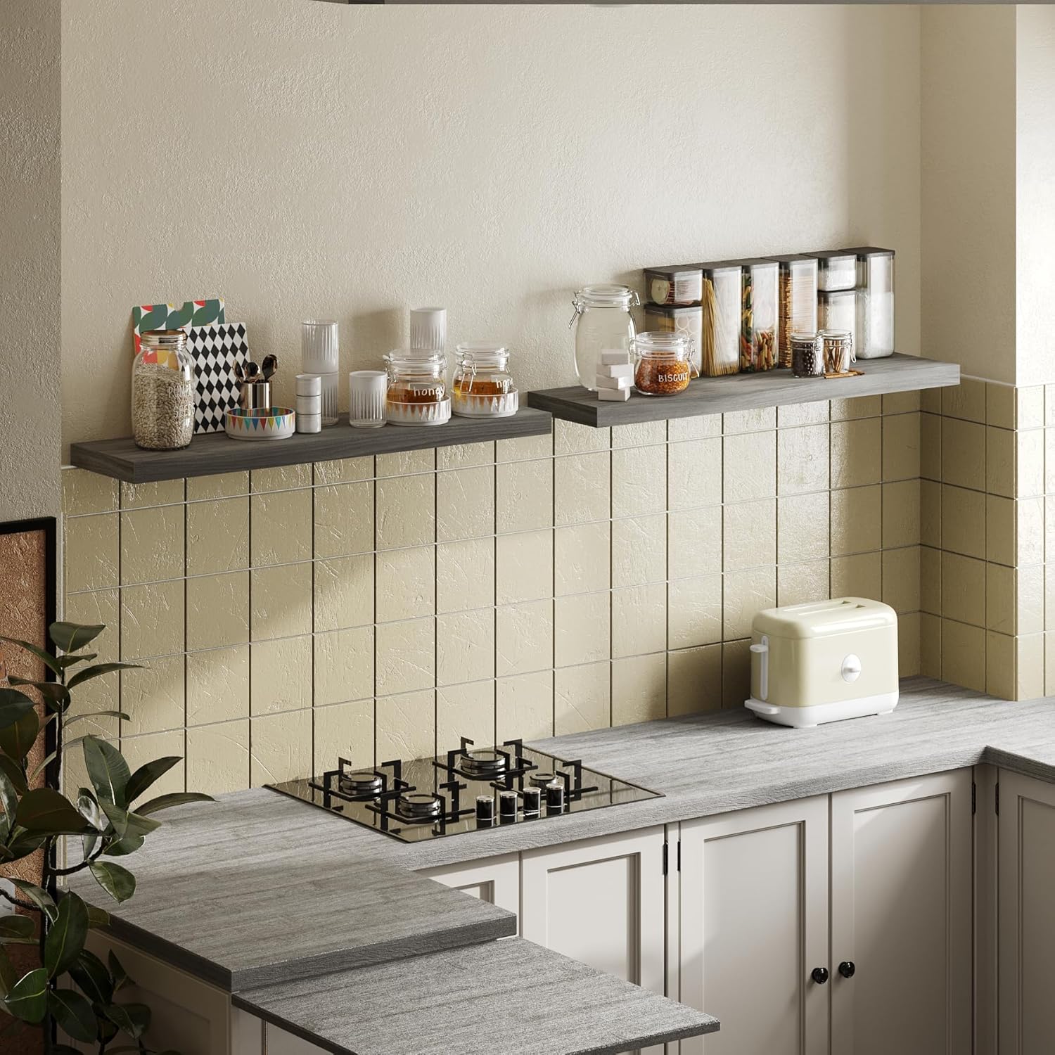• 【GREAT FOR ANY ROOM】Our wood floating shelves are made of MDF with a frosted surface texture for a mordern feel that blends perfectly into a variety of different scenes. Having this large floating shelf not only for its decoration effect, but also for its high practicality. It can be used for organizing all household rooms, such as bedroom, living room, study, toilet, cloakroom, even kitchen and warehouse.
