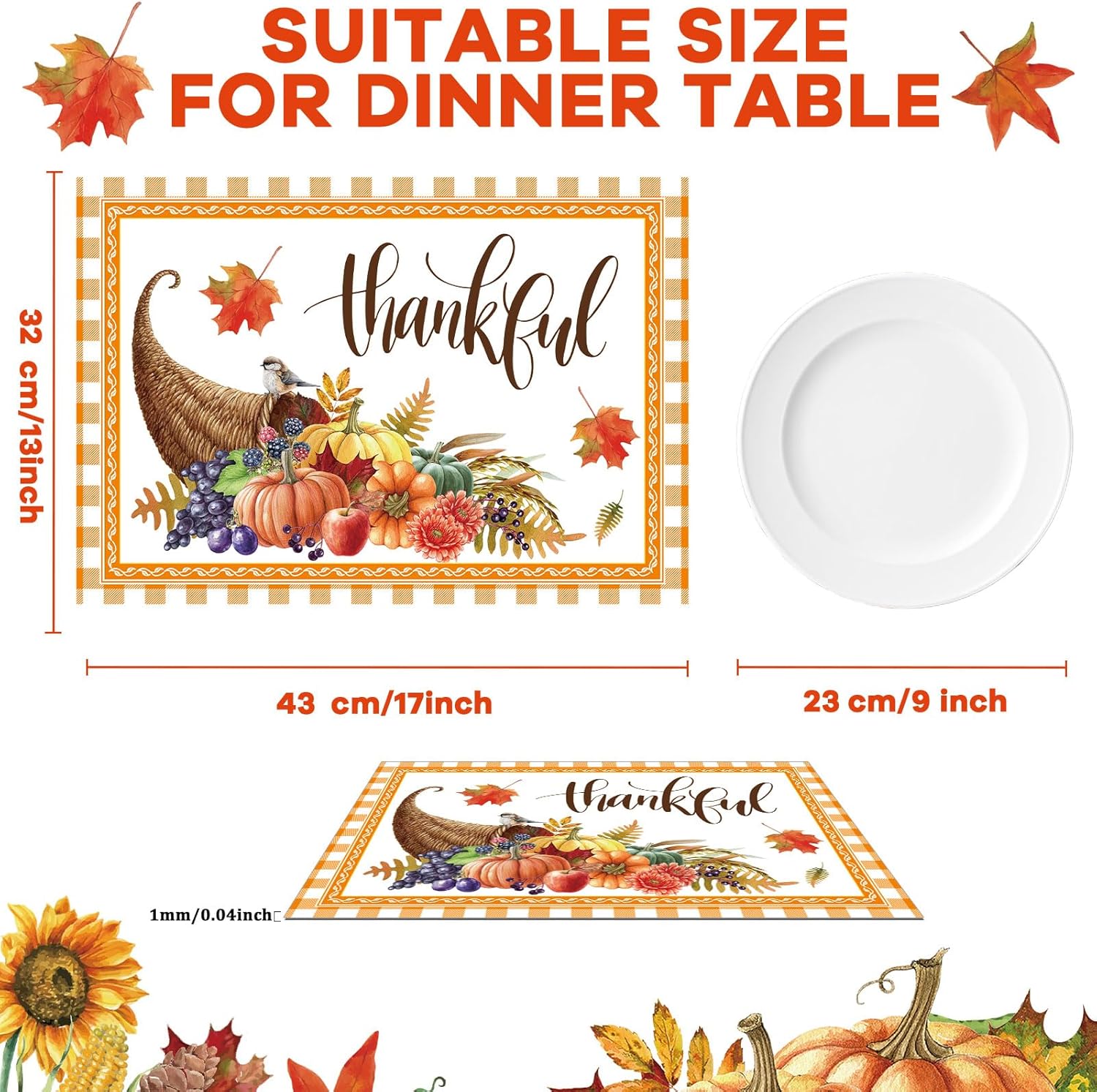 • 【Thanksgiving Placemats】You will receive 6 pieces Thanksgiving Day plastic placemats. Measuring at 17.0 x 13.0 inches/43 x 32cm, Thanksgiving table mats are the ideal size to accommodate your fall party or gathering. With a sufficient quantity and perfectly sized dimensions, fall harvest place mats are sure to be a hit at your event.