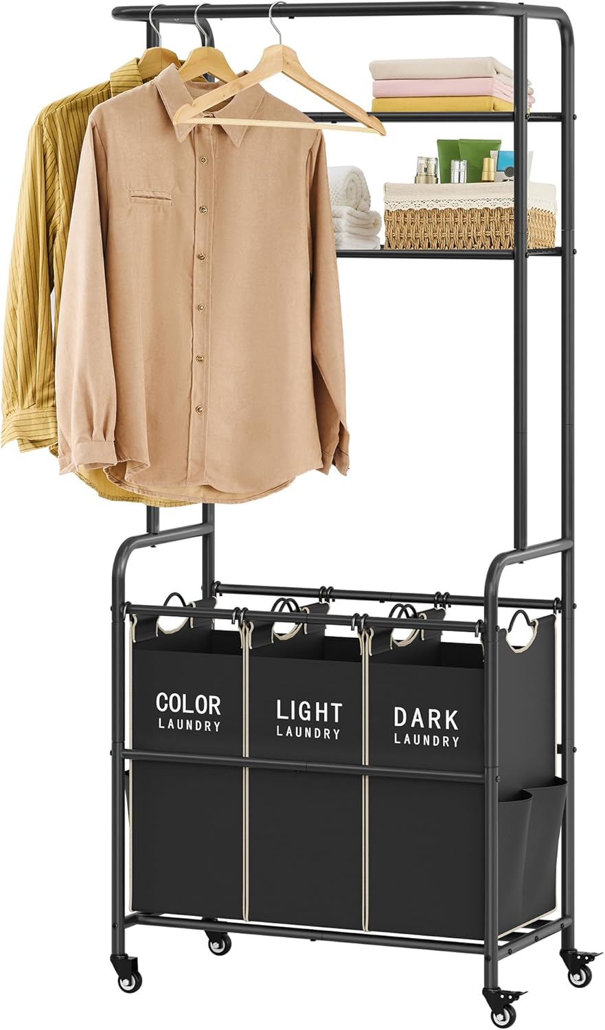 • All-in-One Laundry Sorter: Measuring 29.13"L x 16.14"W x 70.86"H, the laundry hamper with shelf features 3 laundry bags for easy sorting, shelves to store essentials, and a sturdy hanging bar for drying or hanging clothes