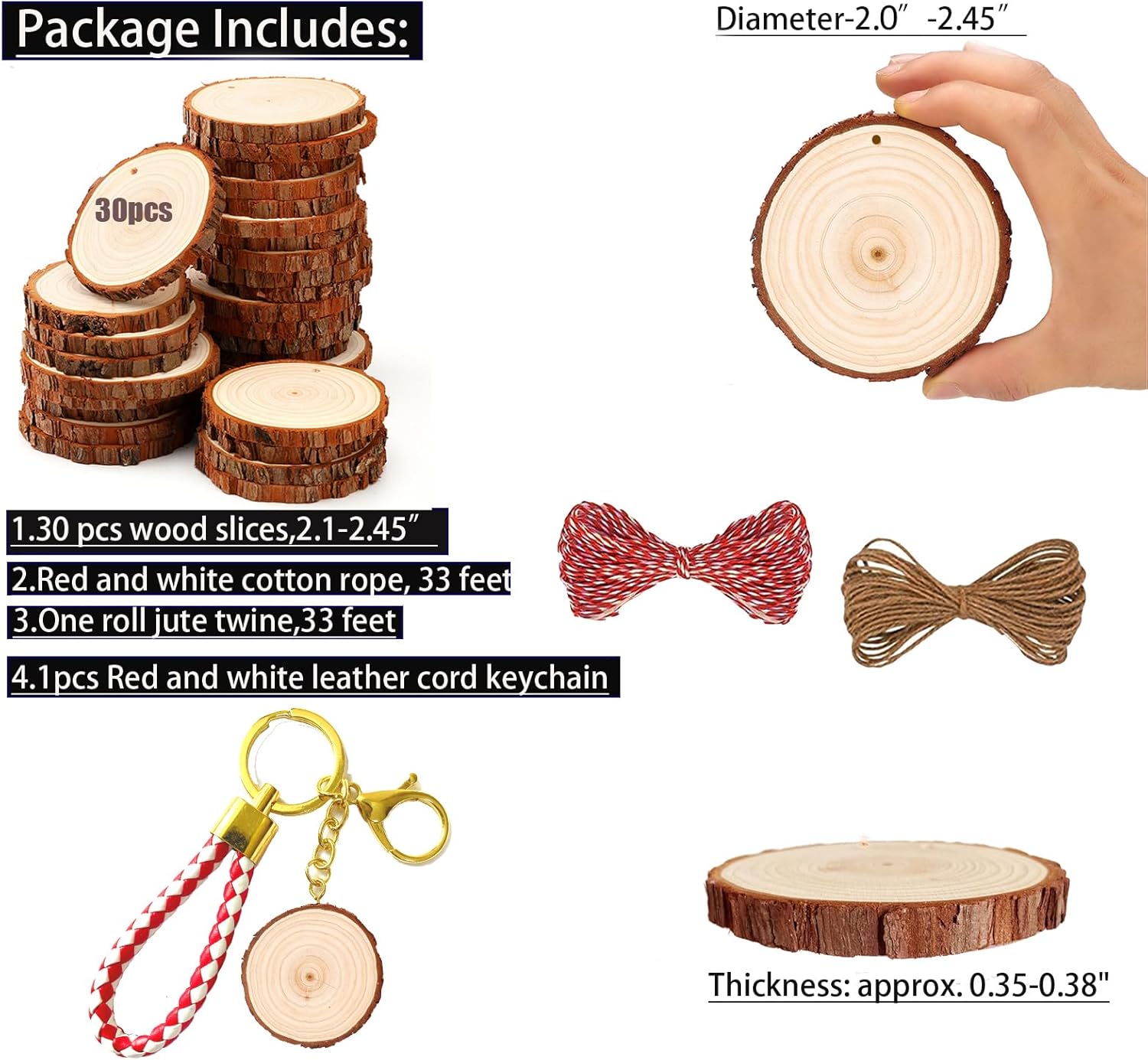 • A Rainbow of Possibilities - Our unfinished wood crafts are the perfect blank canvas for your imaginative ideas. Use these wooden circles for crafts to create personalized items or add a unique touch to your home decor. Bonus Keychain Included - Along with 30 wood slices, each package also comes with an additional tree slice attached to a charming keychain . Add a personal touch to your keys or bag, or give it as a thoughtful, handmade gift.