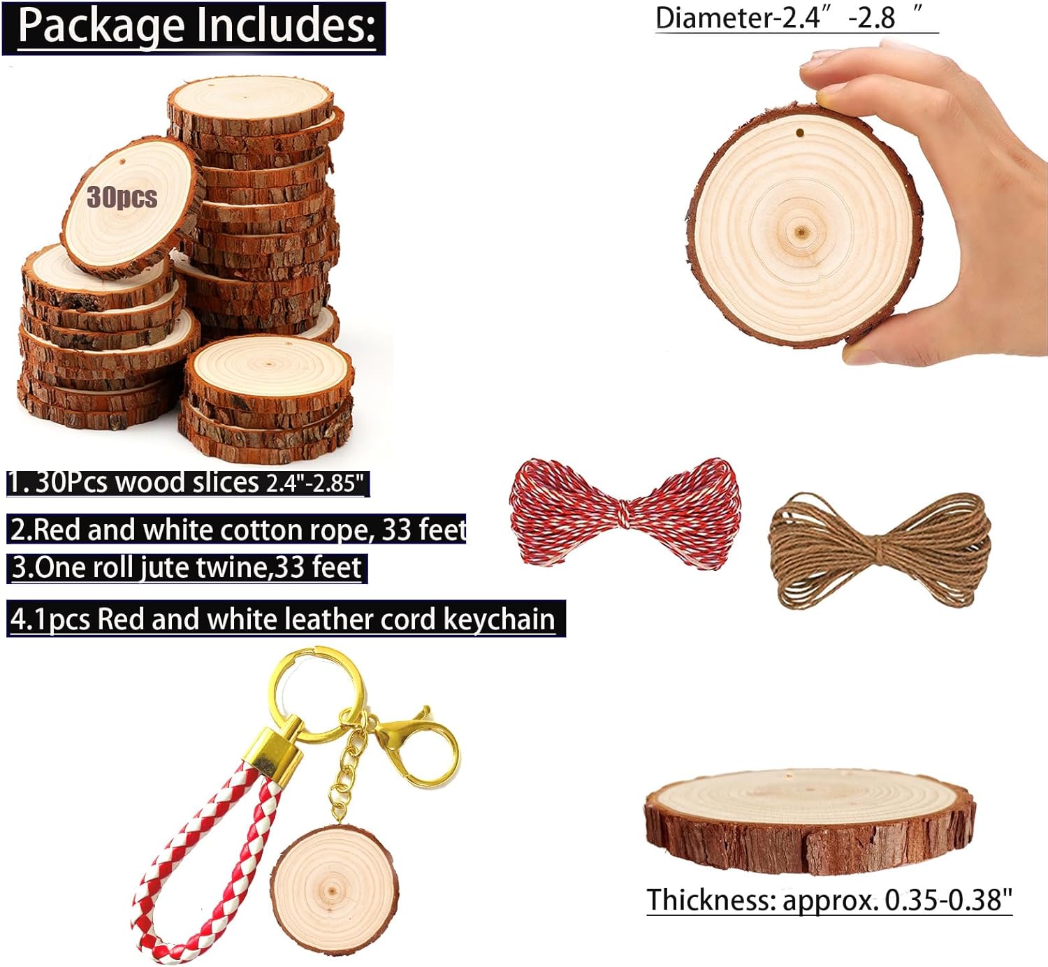 SENMUT Unfinished Wood Slices 30pcs 2.4"-2.85" Wood Circles for Crafts Predrilled Natural Wood Rounds Wooden Discs Christmas Wood Ornament for Crafts