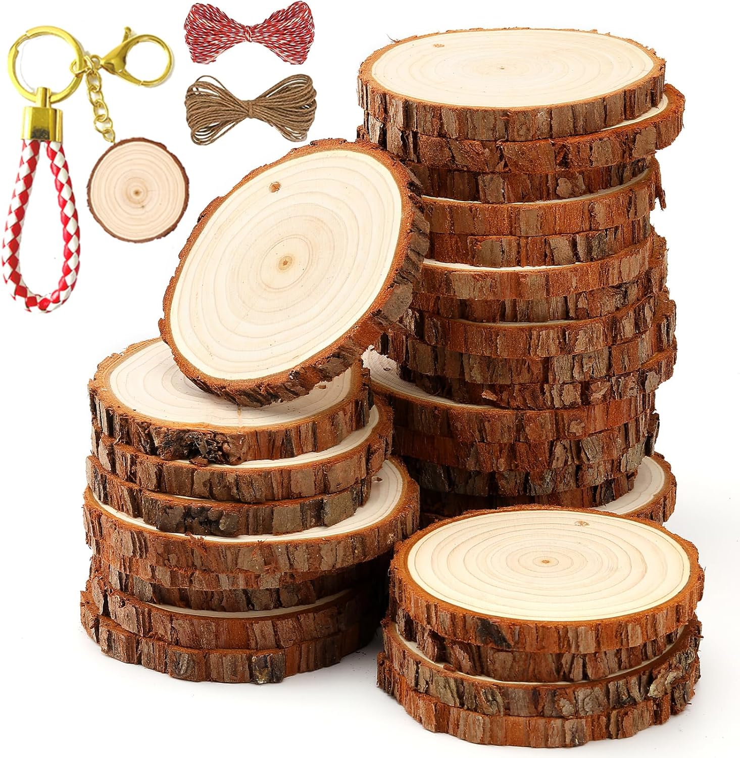 • A Rainbow of Possibilities - Our unfinished wood crafts are the perfect blank canvas for your imaginative ideas. Use these wooden circles for crafts to create personalized items or add a unique touch to your home decor. Bonus Keychain Included - Along with 30 wood slices, each package also comes with an additional tree slice attached to a charming keychain . Add a personal touch to your keys or bag, or give it as a thoughtful, handmade gift.