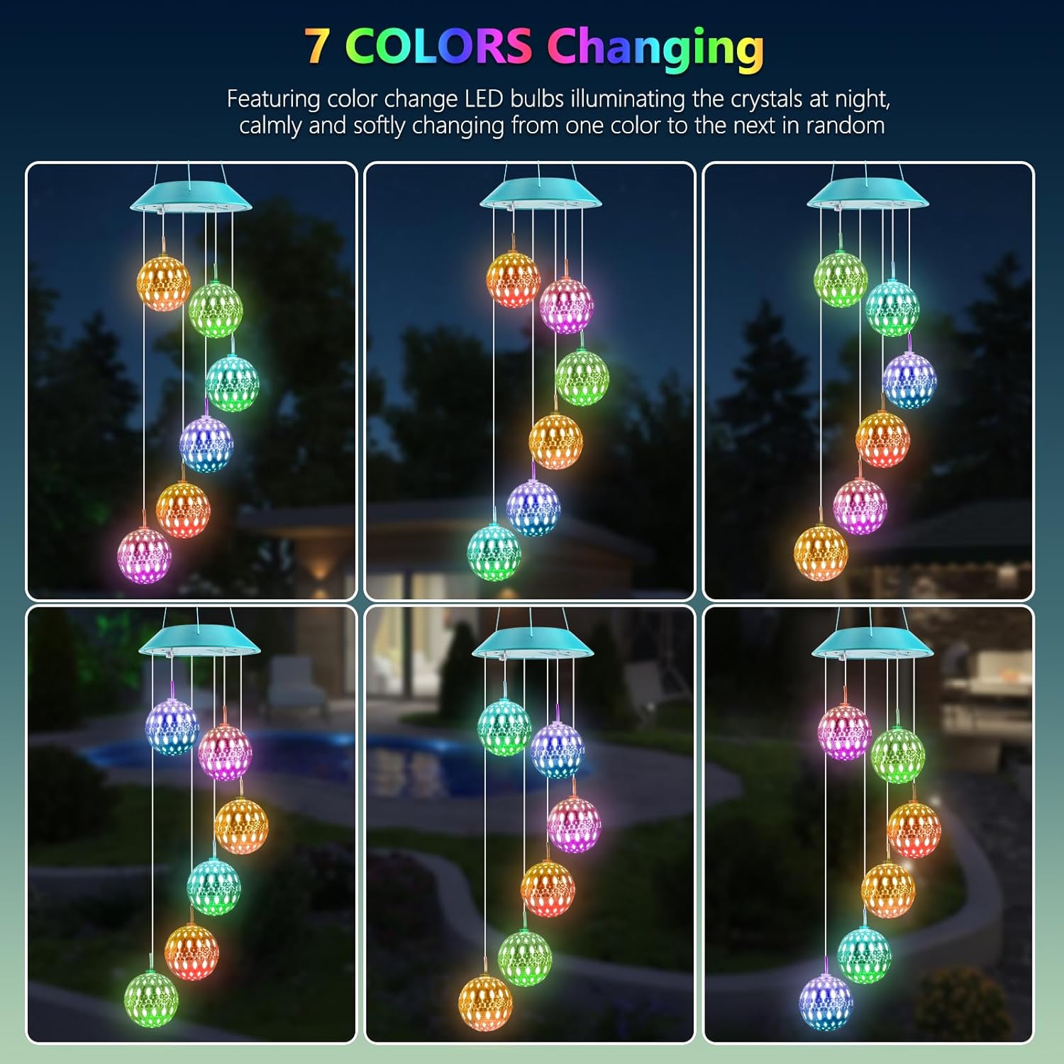 • 【7 Colors Changing Decorative Mobile Lights】 The solar ball decorative lights change color alternatively between red, green, orange, blue, yellow, purple and white, one color gradually transitions into another creating a surreal visual effect, adds a charming display of lights and make your surroundings look dreamy and magical. This solar wind chimes will definitely suitable for your bedroom, patio, balcony, window or garden decoration.
