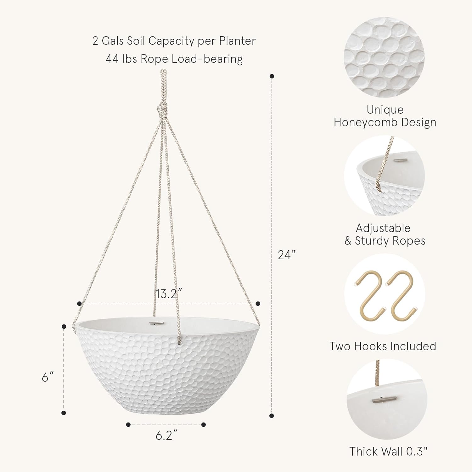 LA JOLIE MUSE Hanging Planters for Outdoor Plants, Large Hanging Planter with Drain Holes, Outdoor Hanging Flower Pots, White Stone, Honeycomb (13.2 Inch, Set of 2)