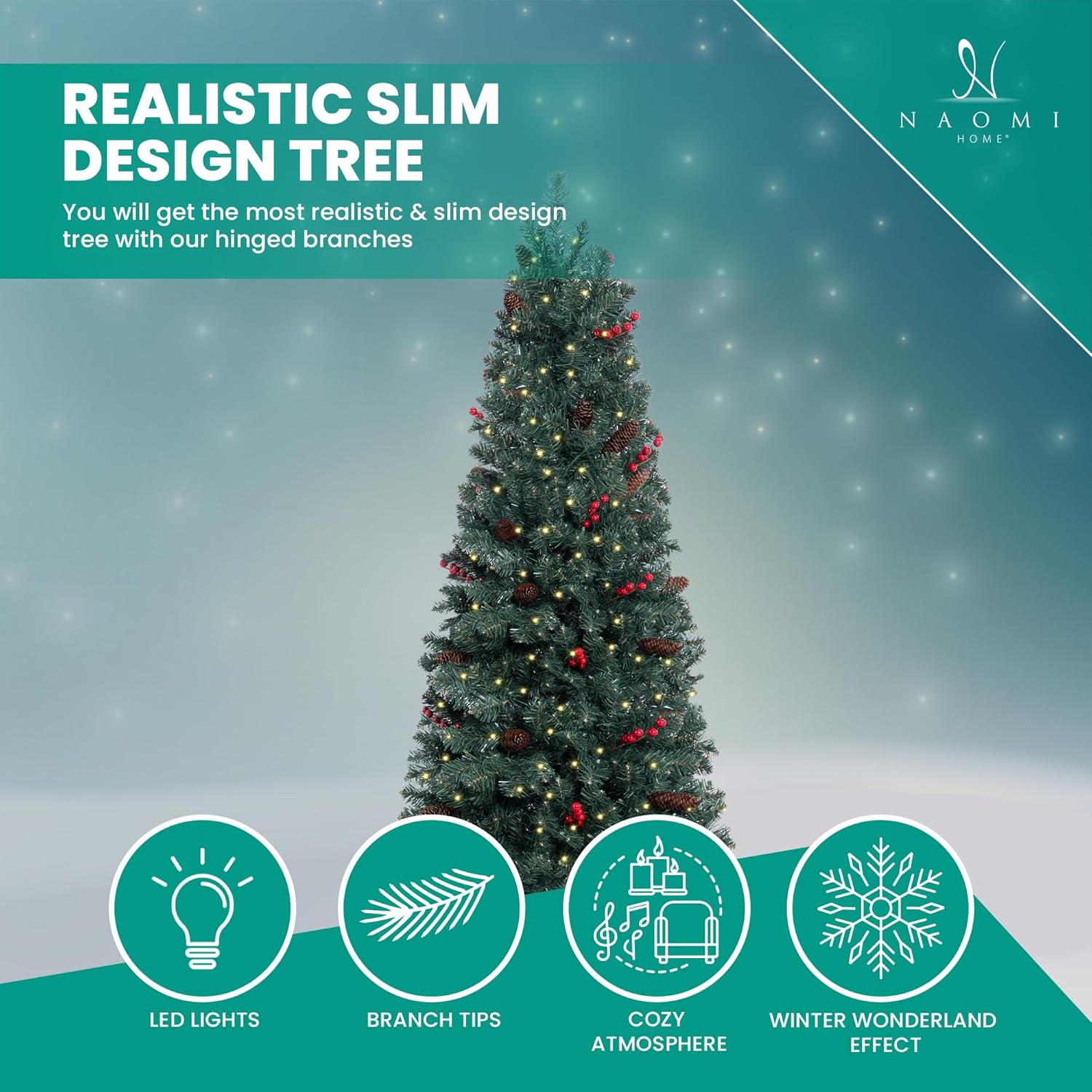 Naomi Home Belen 6.5ft Pencil Christmas Tree Prelit pre-Decorated with Pine Cones, Red Berries, 754 Branch Tips, 250 Warm Lights and Metal Stand, 30" Wide Skinny Christmas Tree with Lights