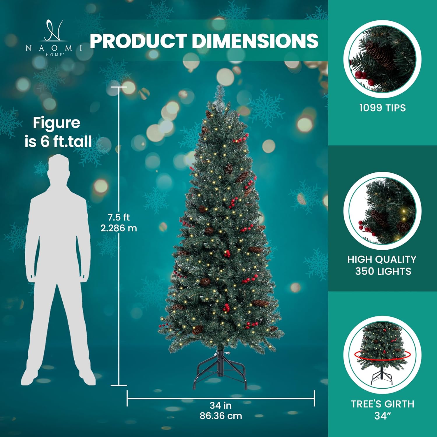 • DENSER, REALISTIC & FULL : Our 7.5 feet Pre Lit Christmas Tree comes with 1099 branch tips, 350 warm lights, & has a girth of 34 inches, which are unmatched for a 7.5ft Christmas tree. With the Naomi Home Artificial Christmas Tree,you will get the most realistic Prelit Christmas Tree 7.5ft that you can get.You can also checkout other sizes: ( 6.5ft - 754 Branch Tips, 250 Lights, 30" Girth ) ( 9ft - 1457 Branch Tips, 500 Lights, 37" Girth ) ( 4.5ft - 428 Branch Tips, 150 Lights, 25" Girth )