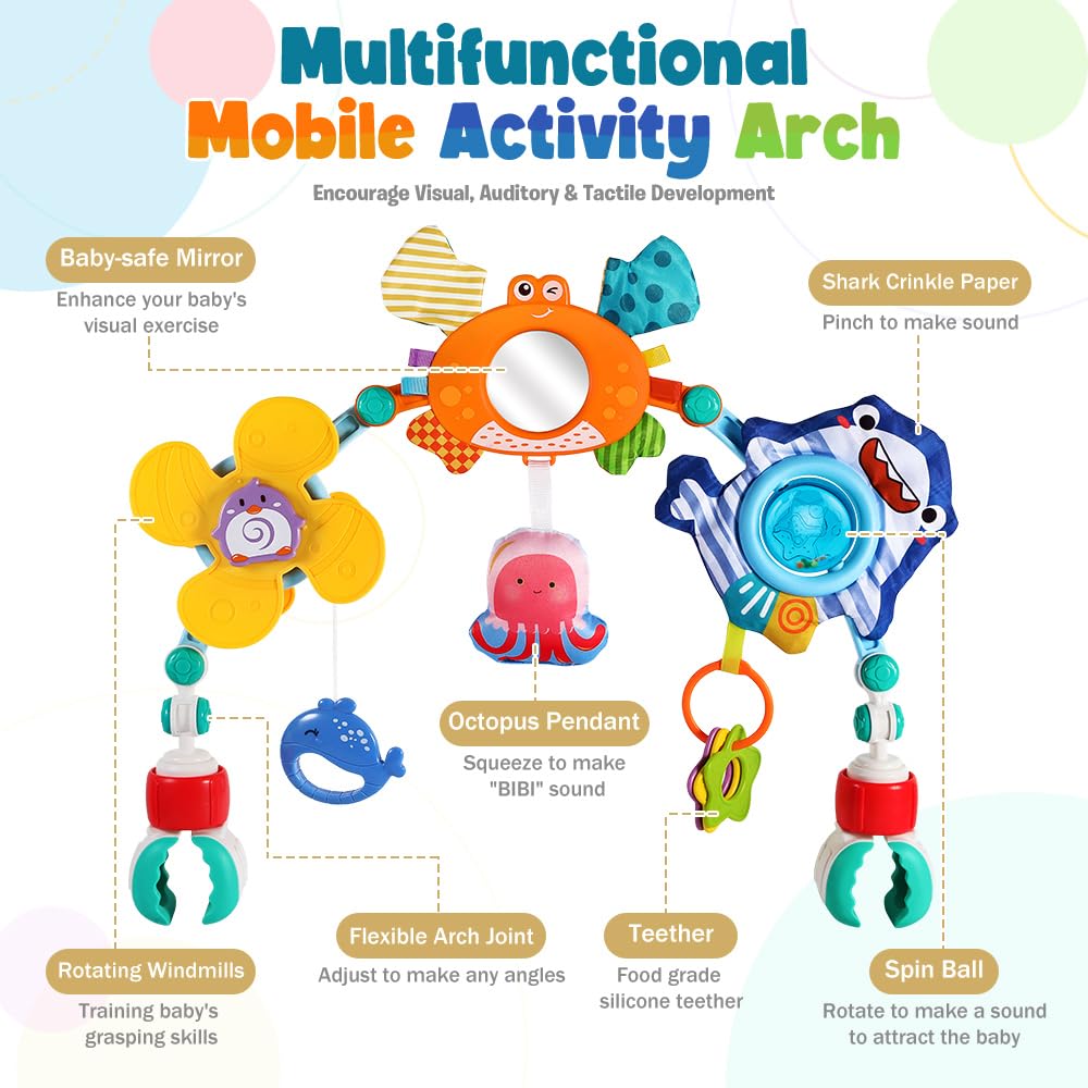 Baby Stroller Car Seat Toys,Adjustable Crib Mobile Activity Arch Toys with Sound Toy and Baby Hanging Toys,Sensory Play Travel Bouncer Bassinet Toy for Toddler Boy Girl 0 3 6 9 12 24 Month