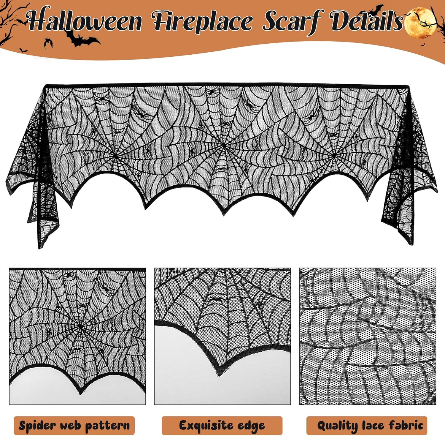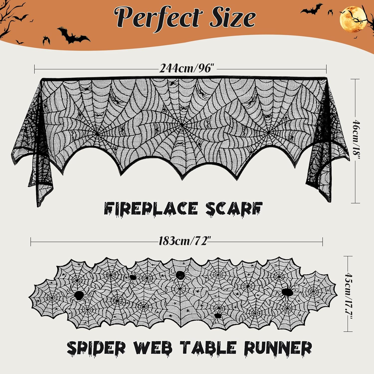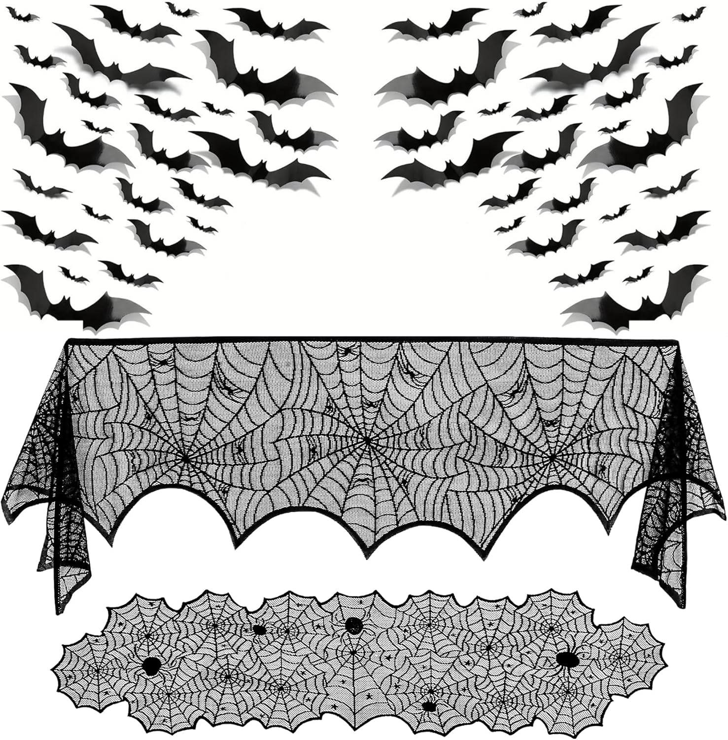 3 Pack Halloween Decorations Sets, Black Lace Spider Webs Table Runner & Halloween Cobweb Fireplace Scarf with 120 pcs 3D Bat for Halloween Indoor Decors Party Supplies