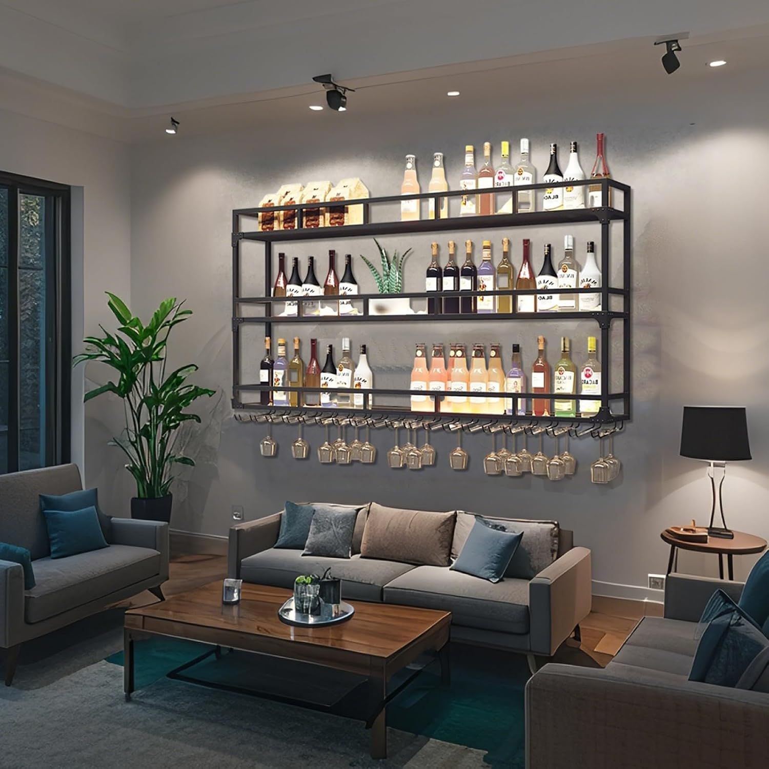 Modern Wine Rack Wall Mounted With Glass Holder,3-Tier Bar Liquor Shelf,Black,Metal Large Capacity Hanging Wine Storage Racks,Iron Floating Bar Shelves For Liquor Bottles,For Kitchen Dining Room