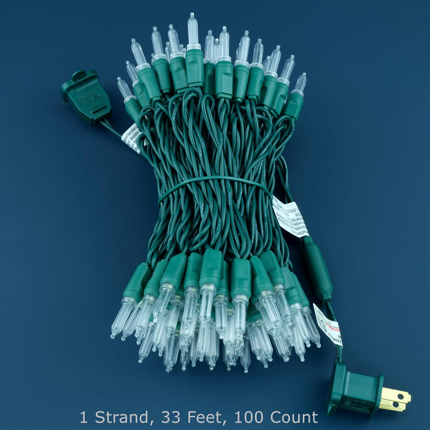 • SPECIFICATIONS ☀ Each pack contains 1 strands of one-piece string lights, total length 33 feet with 100 count cool white mini lights. 22 AWG green cord, 4" lead, 4" spacing, 4" tail.