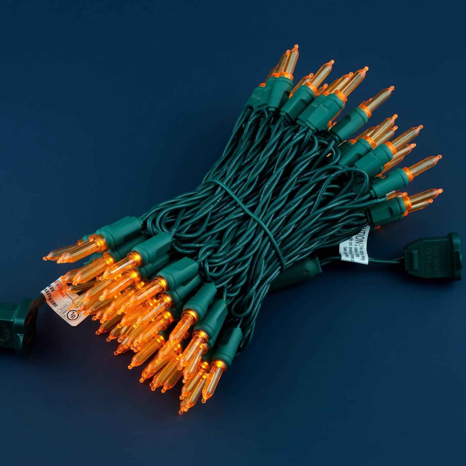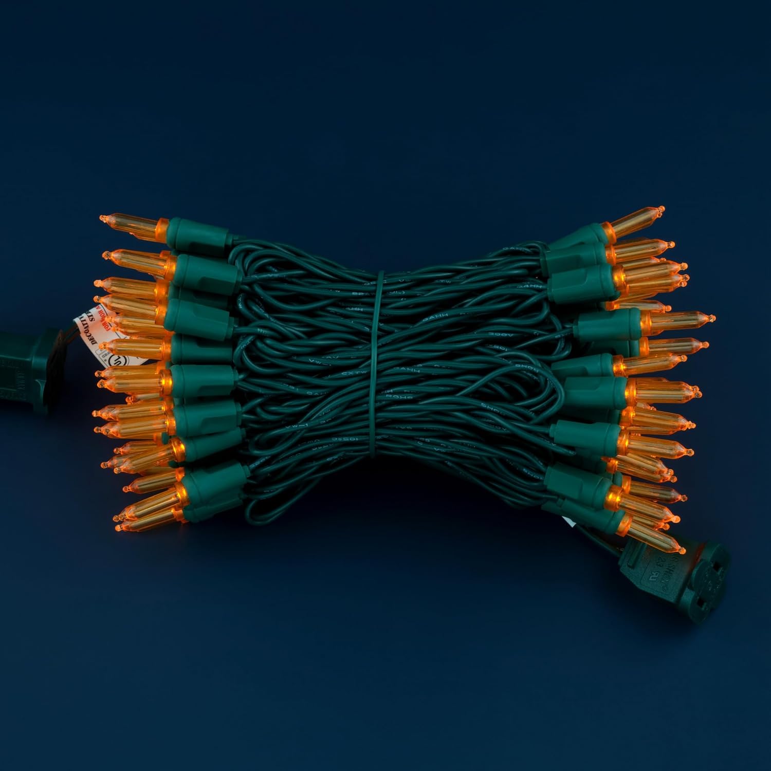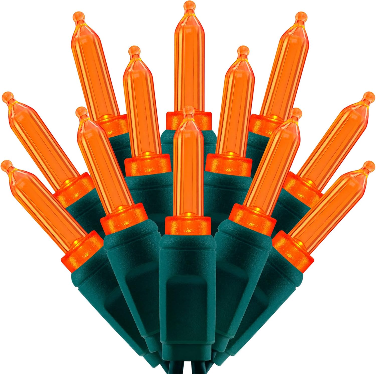 • SPECIFICATIONS ☀ Each pack contains 1 strands of one-piece string lights, total length 33 feet with 100 count orange mini lights. 22 AWG green cord, 4" lead, 4" spacing, 4" tail.