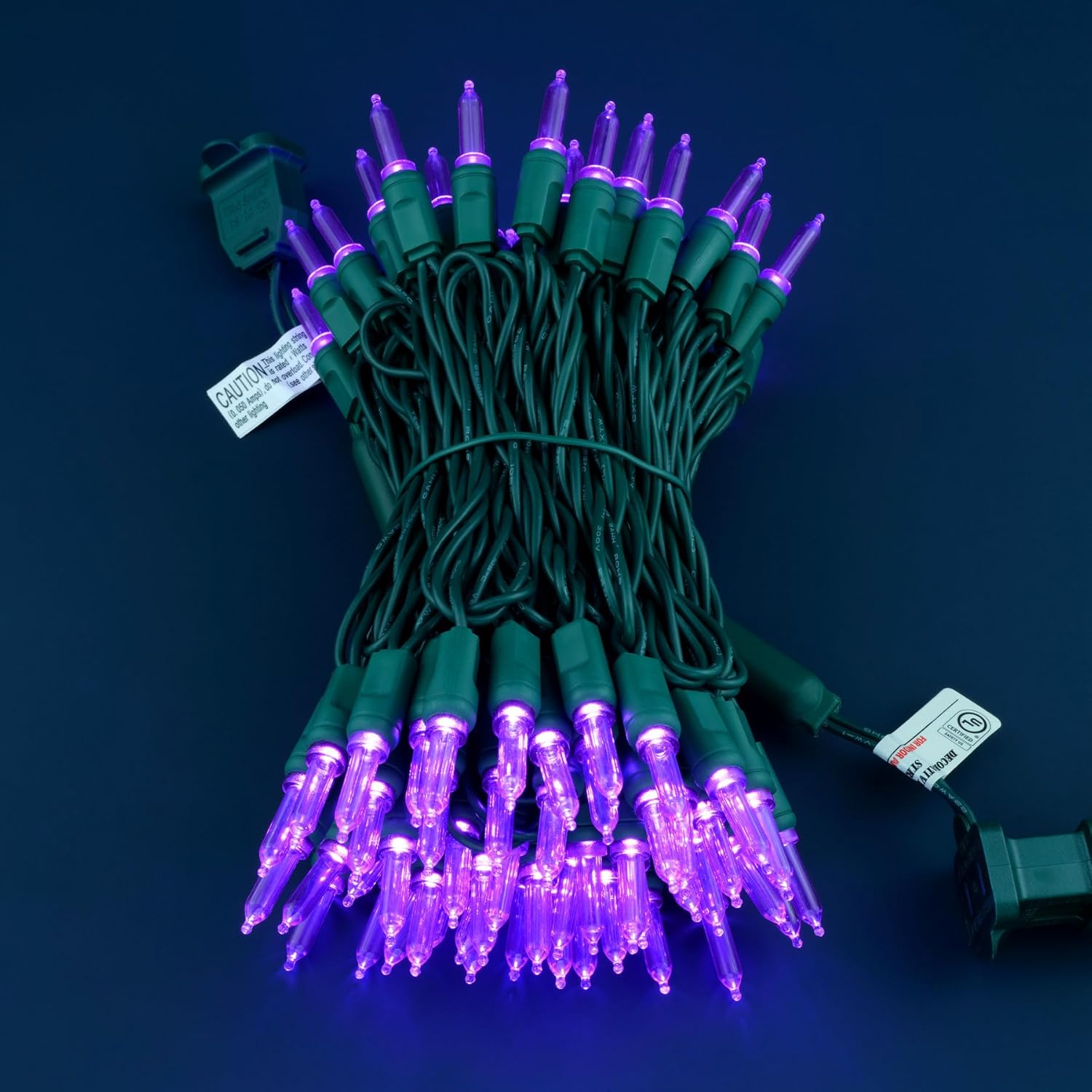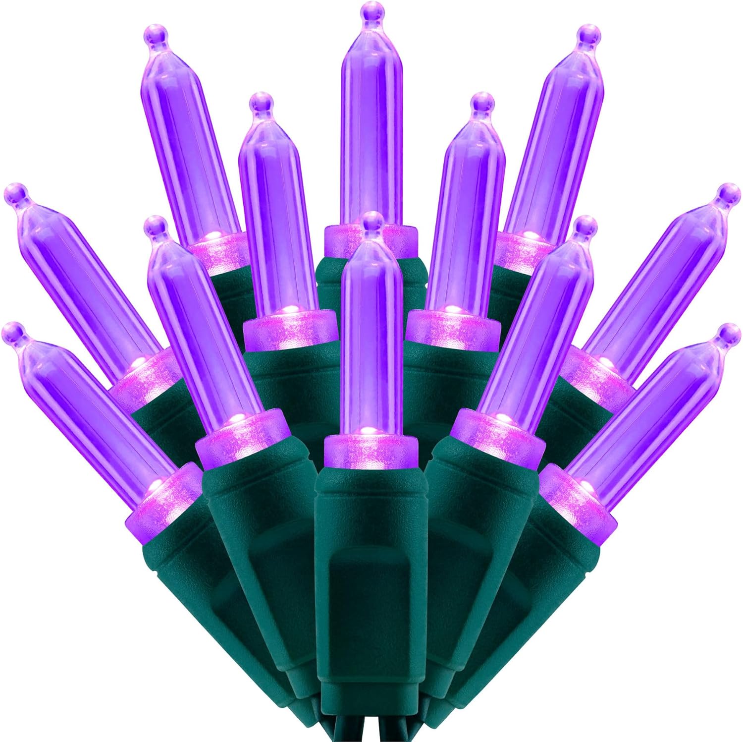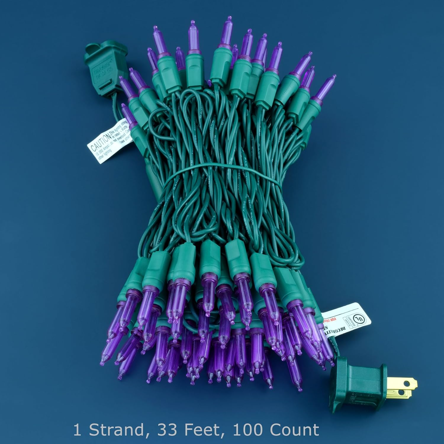 • SPECIFICATIONS ☀ Each pack contains 1 strands of one-piece string lights, total length 33 feet with 100 count purple mini lights. 22 AWG green cord, 4" lead, 4" spacing, 4" tail.