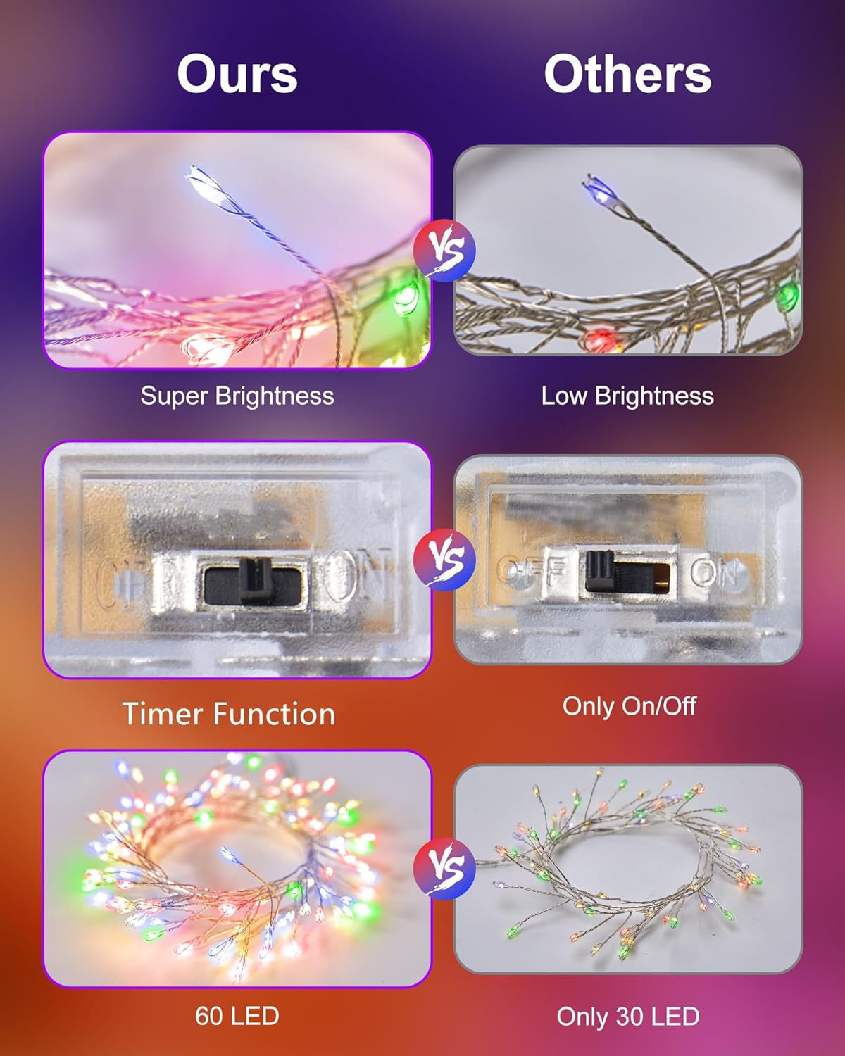 • Brighter Lights: 5 feet 3 x AA battery operated twinkling firecracker cluster lights, the luminous miniature LED light looks like a drop of light attached to a shiny wire, with steady 360 degree viewing angle they illuminate in every direction