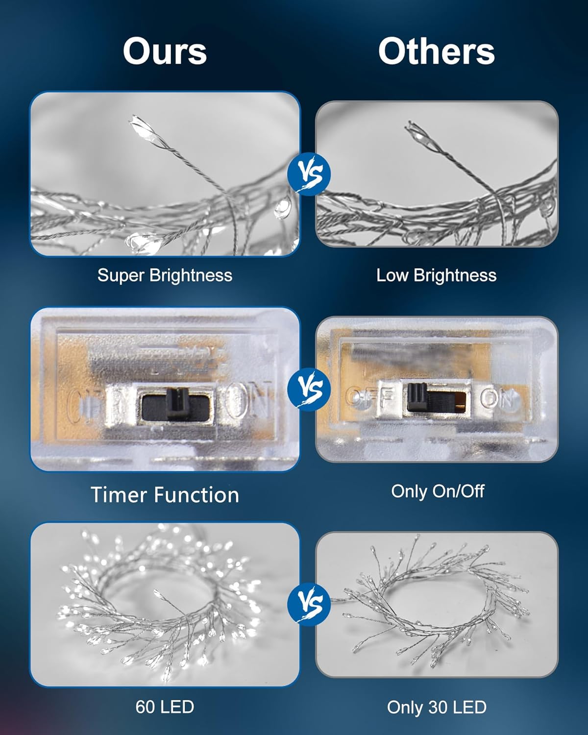 • Firefly Starry Lights: 2 pack 60 super bright pure white LED lights on 5 feet long ultra-thin wire with 1 Inches distance between LED bulbs and 12 Inches clear cable between wire and battery box, 6 hours timing lighting, steady on or steady on + timer mode optional