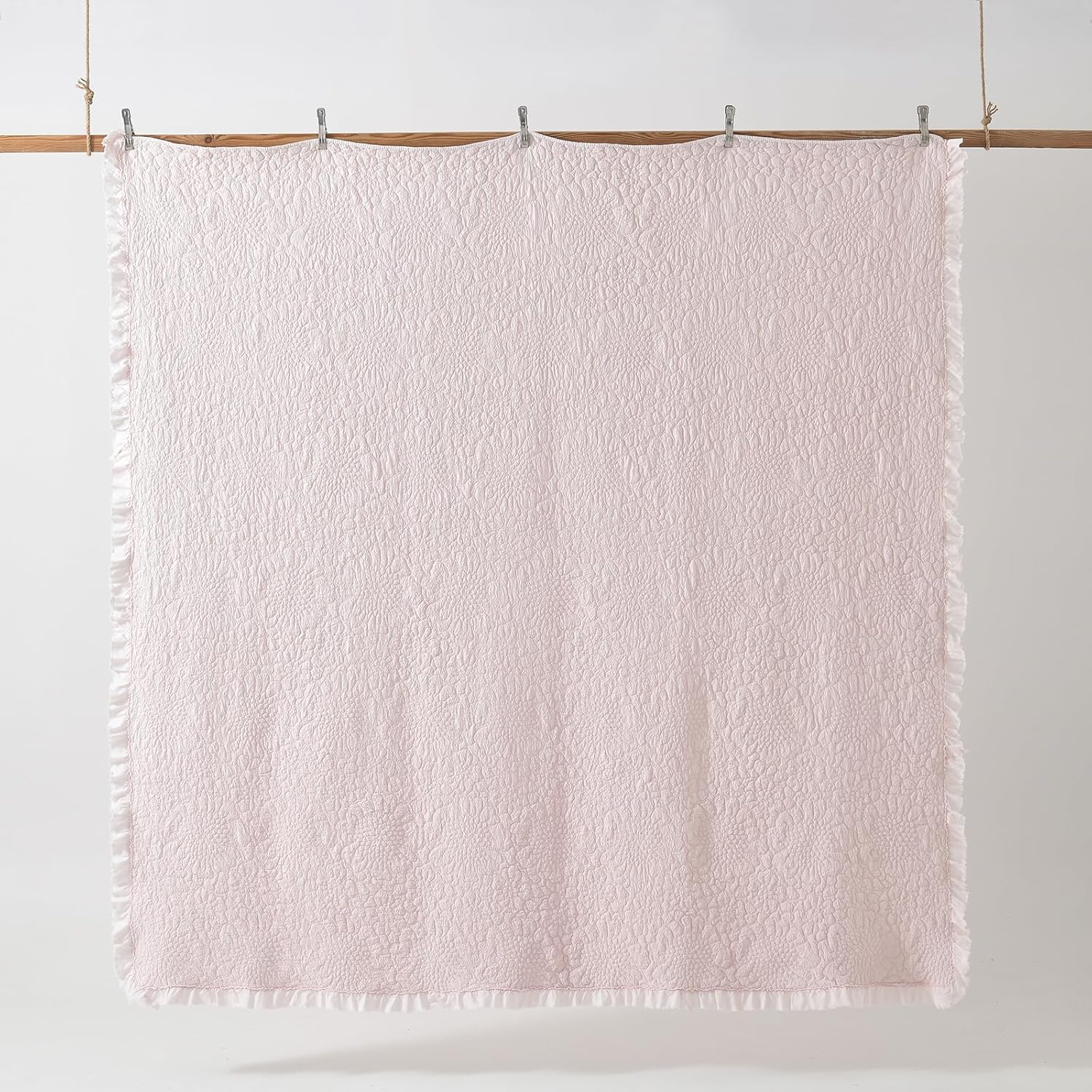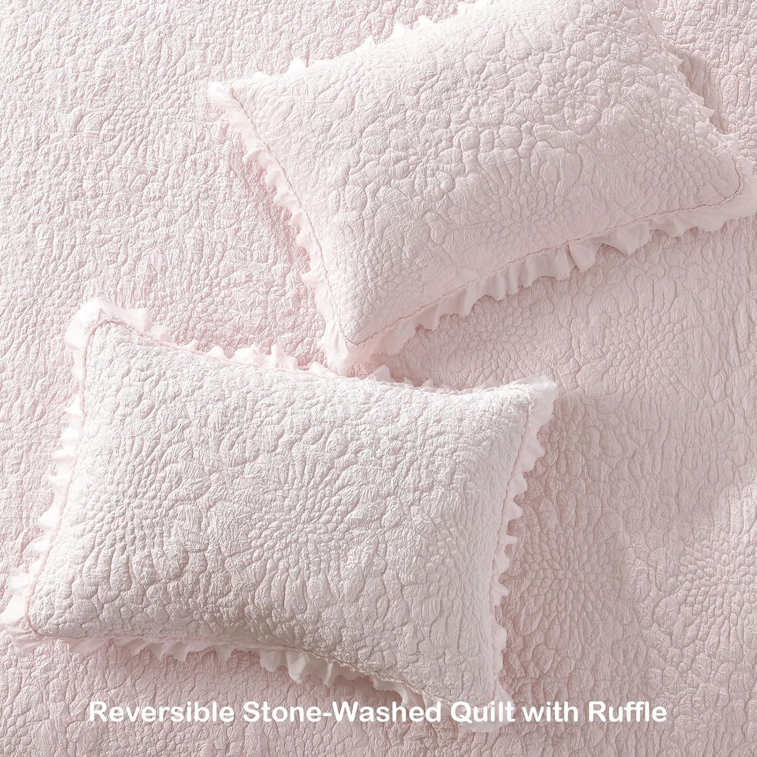 HORIMOTE HOME Pink Ruffled Quilt Twin Size, Stone-Washed Microfiber Lightweight Crinkled Farmhouse Rustic Shabby Chic Bedding Set, 2 Pieces Reversible Bedspread with Pillow Sham for All Season