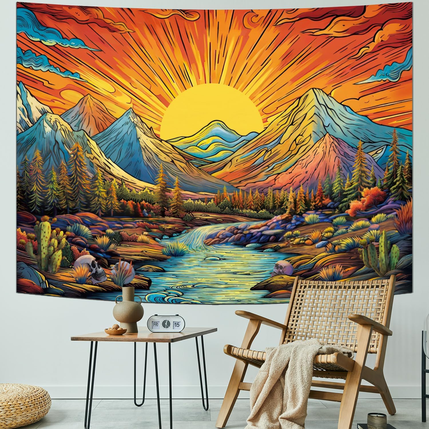 Serborlur Boho Sun Mountain Tapestry Trippy Forest Tree Tapestry Vintage Aesthetic Magic River Tapestries Nature Landscape Wall Hanging for Bedroom Home Decor (70.8" x 92.5")