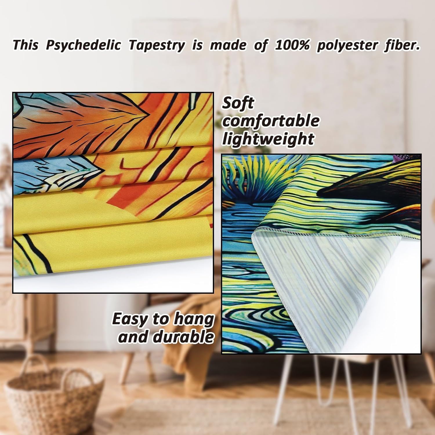 • Material: This trippy sun tapestry is made of high quality polyester fabric, which is soft, durable, lightweight and easy to hang or pack away for your indoor or outdoor use.