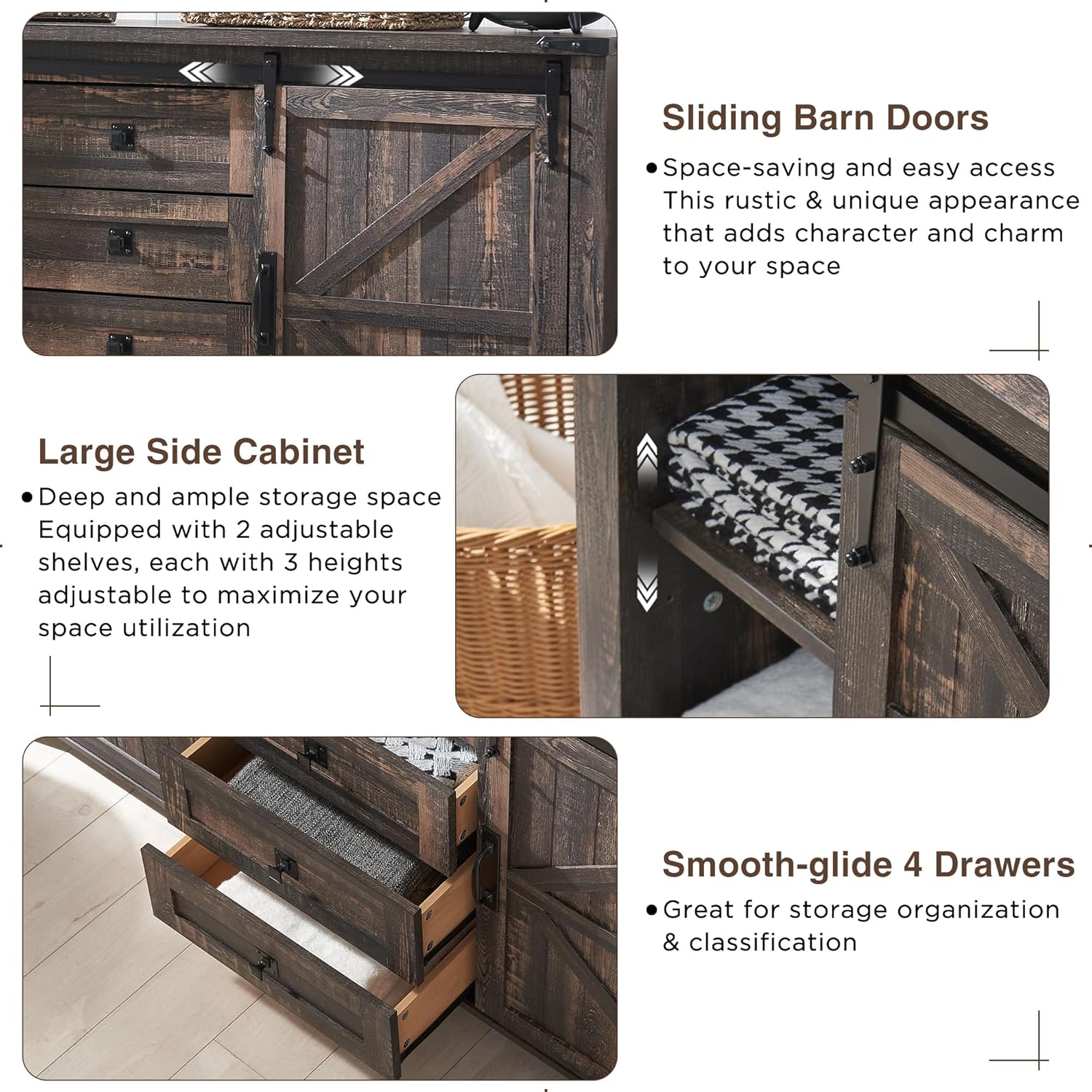 • 60'' CREATIVE 4-DRAWER WIDE DRESSER W/ SLIDING BARN DOORS: This dresser features a great fusion of farmhouse beauty and utility of storage space. This farmhouse 4-drawer dresser measures 60''W x 15.57''D x 31.25''H. It features 4 drawers (drawer size: 16.2''W * 12''D * 4.1''H) & 2 space-saving sliding barn doors w/2 adjustable shelves. The combination of drawers and sliding barn doors significantly adds more flexible storage space to your home for socks, clothing, linens & cozy throw blankets.