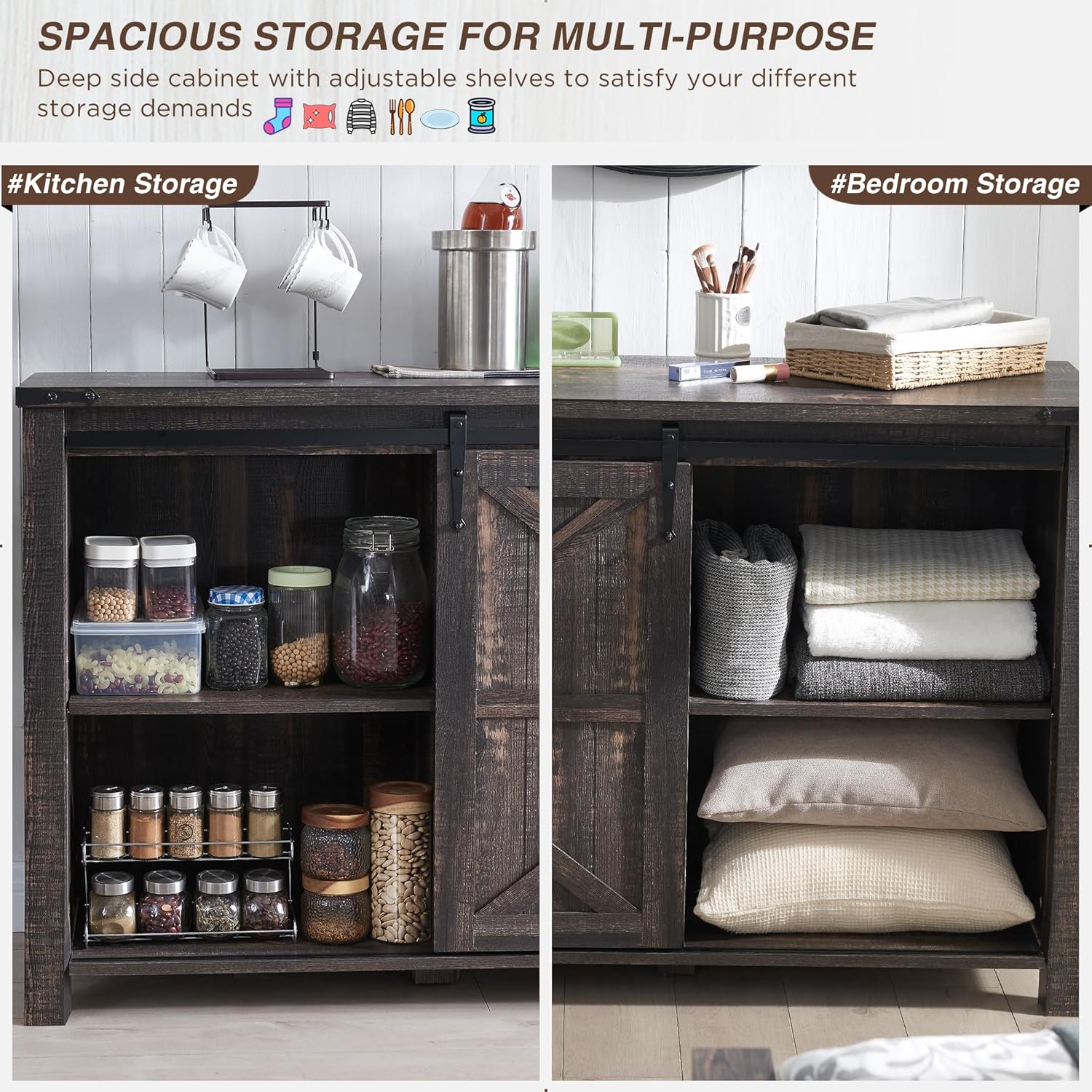 • SLIDING BARN DOORS: The farmhouse space-saving barn door slides open on a metal track to reveal adjustable shelf space, allowing you to hide or show storage spaces freely. The shelf with 3 height adjustable and is also removable enabling flexible storage of different-sized items. The smooth-glide track makes it convenient for people of all ages and abilities to open and close with minimal effort. This wide dresser can be particularly beneficial to maintain a clutter-free and organized look.
