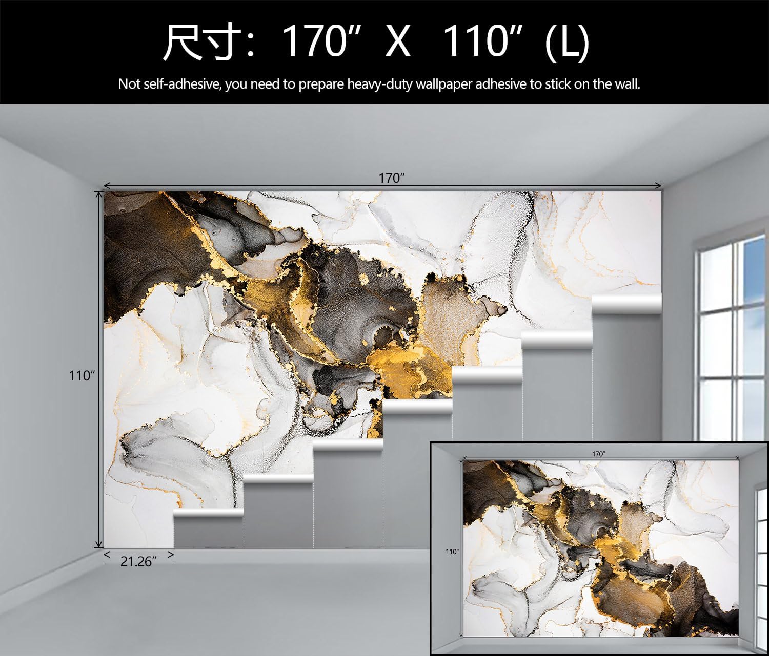 • Mural Size: The total size of this mural wallpaper is 170" x 110" / 432CM x 280CM (W x H), cut into 8 pieces, each measuring 21.26" x 110", for easy installation.