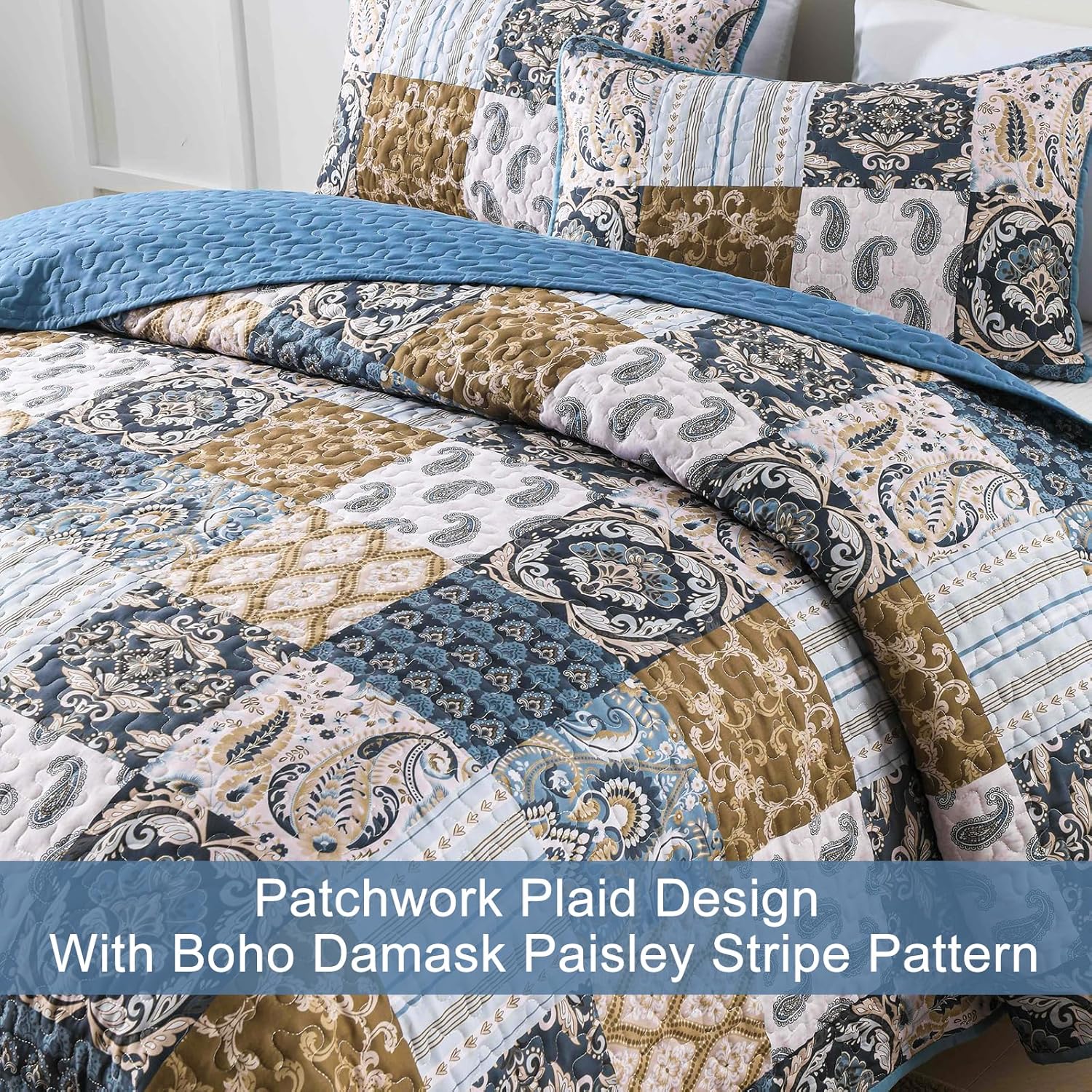 • PATCHWORK BOHO QUILT SET: The boho bedspread queen size bedding set featuring a patchwork plaid design. Combined with bohemian stripe damask and paisley pattern gives this bedspread coverlet a elegant atmosphere.
