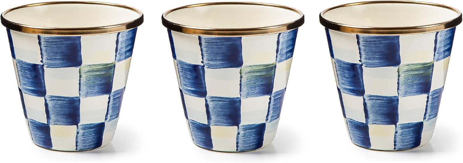 MACKENZIE-CHILDS Enamel Herb Pots, Small Plant Pots for Herbs or Flowers, Set of 3, Blue-and-White Royal Check