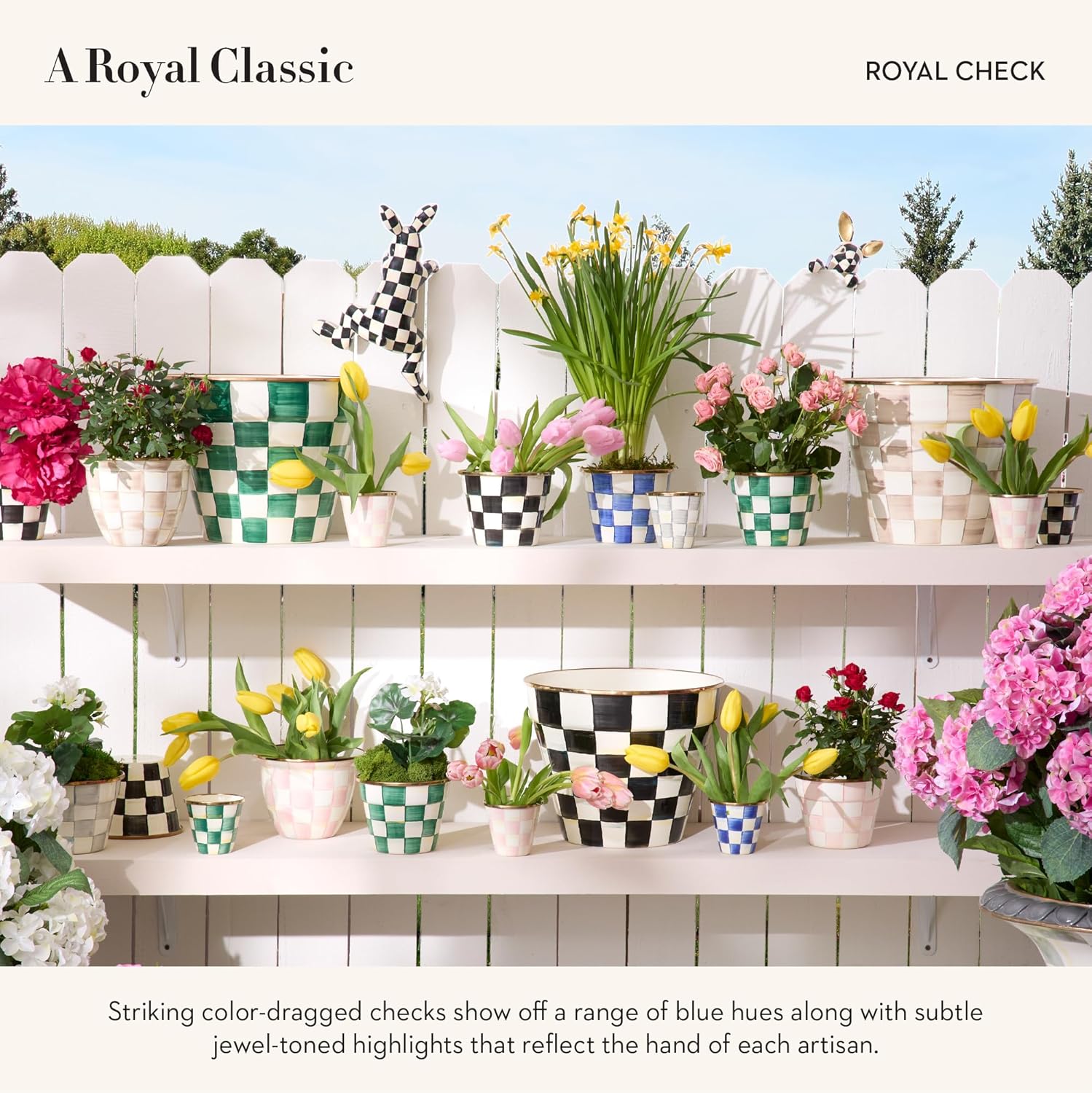 • INDOOR & OUTDOOR PLANTER POTS: This trio of petite Royal Check Enamel Herb Pots is hand painted with blue-and-white color-dragged checks in a regal range of blue hues. Presented in a woven sinamay pouch tied with a black grosgrain bow, this little kitchen herb-garden set even makes for a fun party favor!