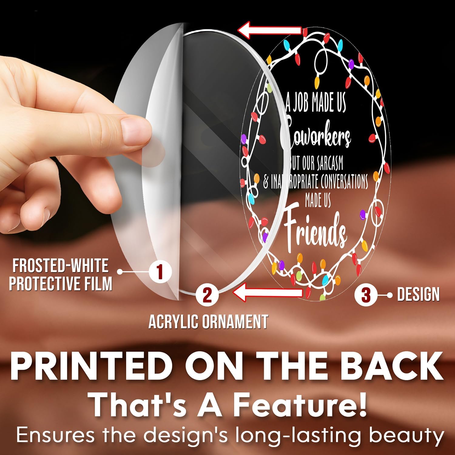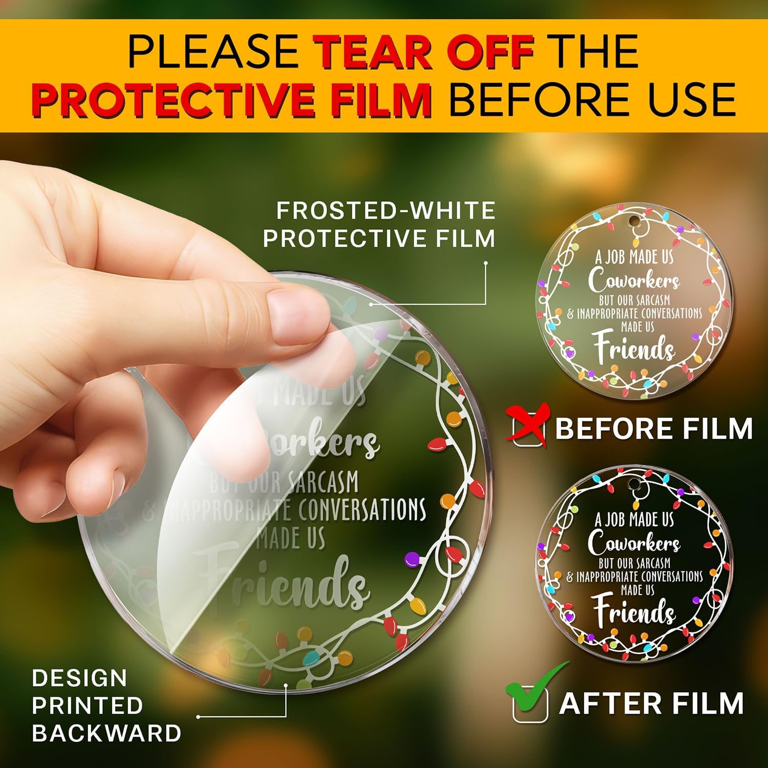 • ACRYLIC MATERIAL: Made from acrylic with a transparent protective film on the front to prevent scratches. The design is printed on the back, and to fully appreciate the ornament's beauty, remove the protective film to reveal the clear acrylic finish