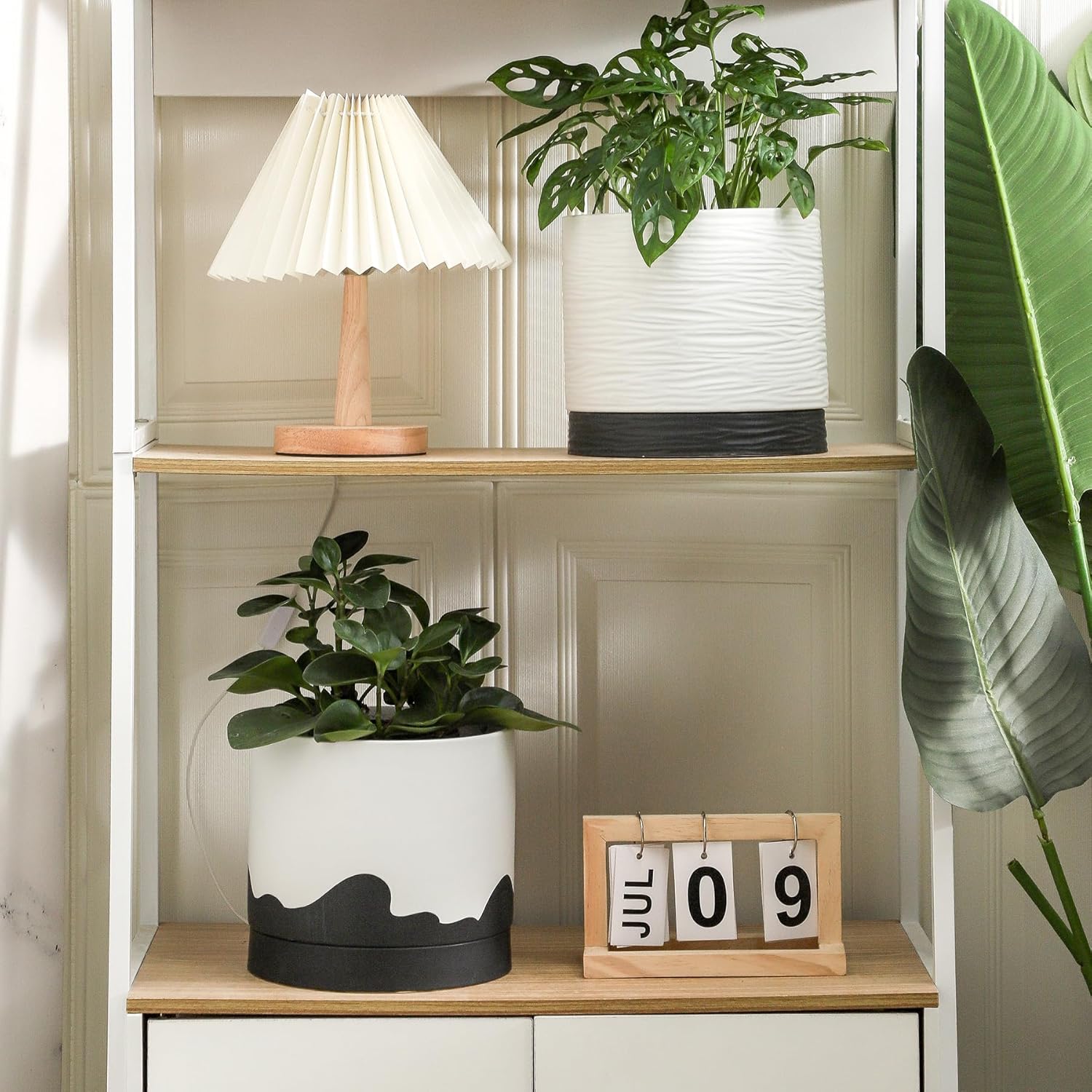 Nihow Ceramic Plant Pot: 8 Inch Planter with Drainage Hole & Saucer for Indoor & Outdoor Plants - Cylinder Round Flower Pot for Succulent/Herbs/Violets - White & Wave Black