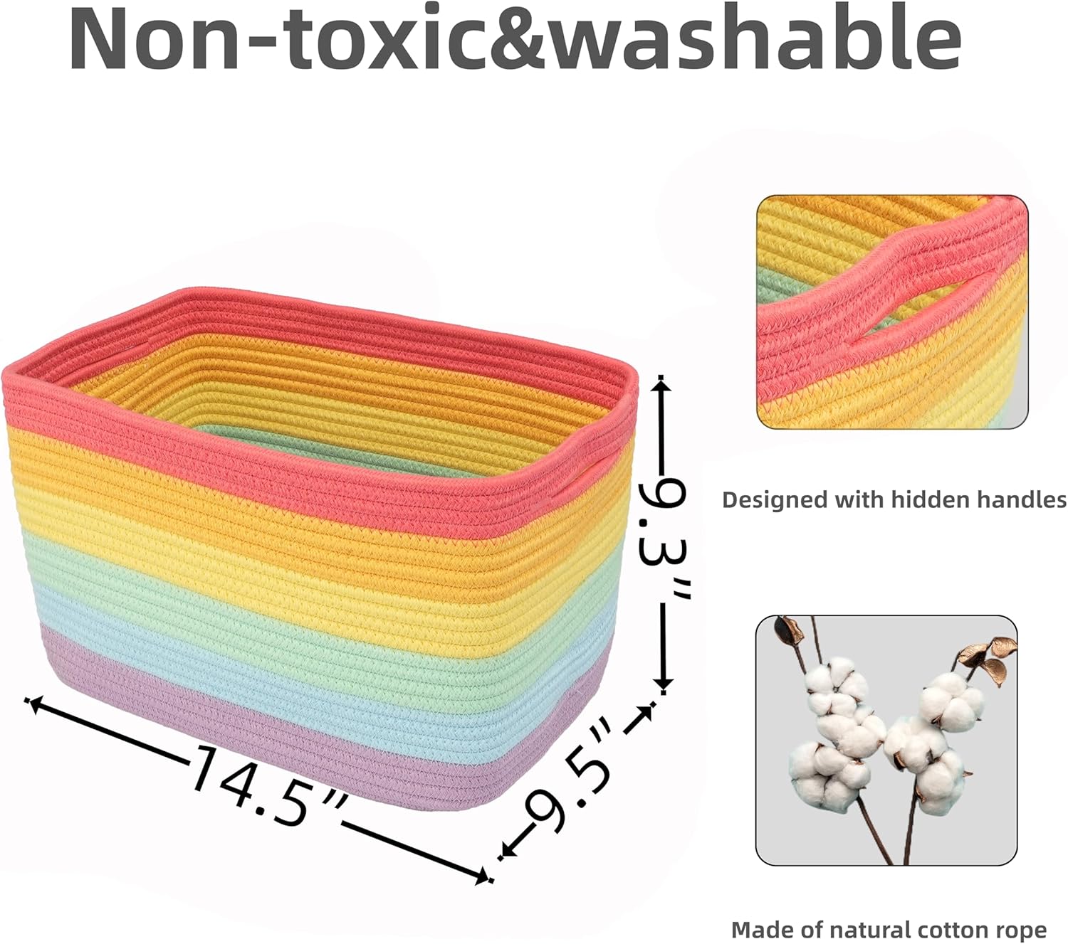 • 1, Medium to Large rectangle woven basket for storage: Our Rainbow rope basket with handles size is 14.5”X9.5”X9.3”. Designed as home storage basket for organizing or storage bins. Could use as cube storage bins,nursery bins,toy basket, pet basket, book basket, towel basket, clothes basket, nursery basket, wicker basket for storage and more. Perfect as storage basket for shelves or closet storage bins to store household items.