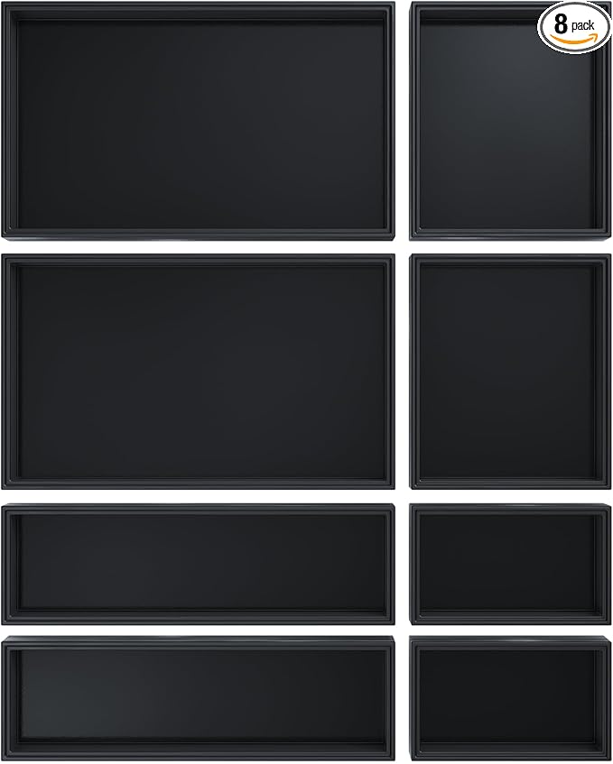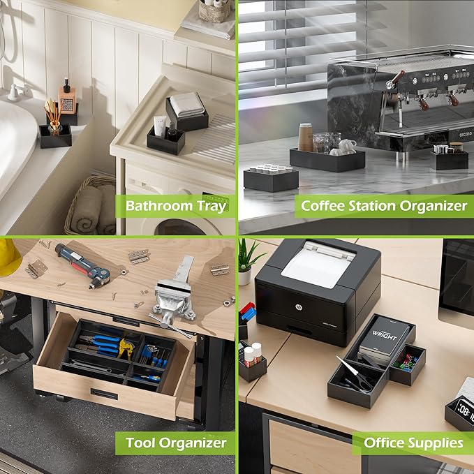 • Stackable Tool Box Organizer for Garage Organization - This black drawer organizer set contains 4 different sizes (totally 8 pcs)for meeting your different needs: 10" x 6", 5" x 6", 10" x 3", 5" x 3". With groove design, our tool box organizer can be stacked as needed. Save your desk space when using it on the countertop, and you can also make full use of the height of the space in the drawer