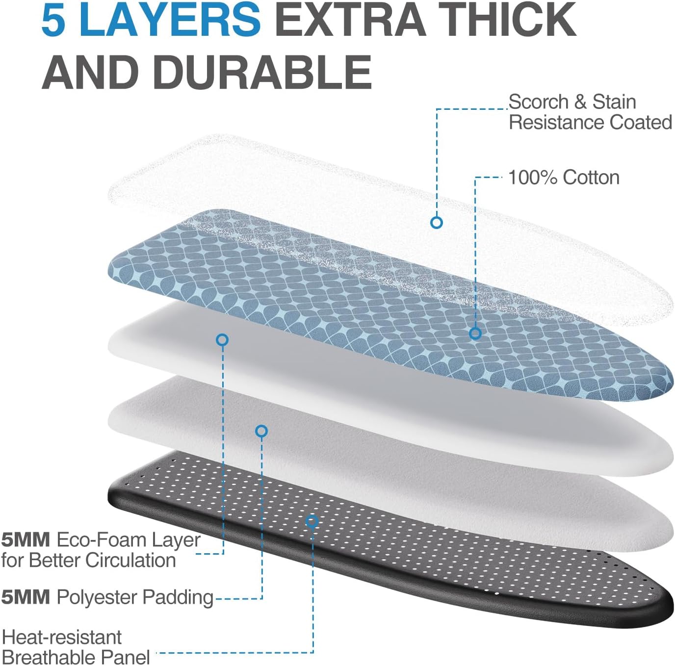 • Innovative Triple Layer Cover: The ingenious fusion of 5mm needle-punch cotton, 5mm sponge padding, and high-quality heat-resistant fabric creates an innovative combination that guarantees swift and flawless results, doubling your ironing speed time.
