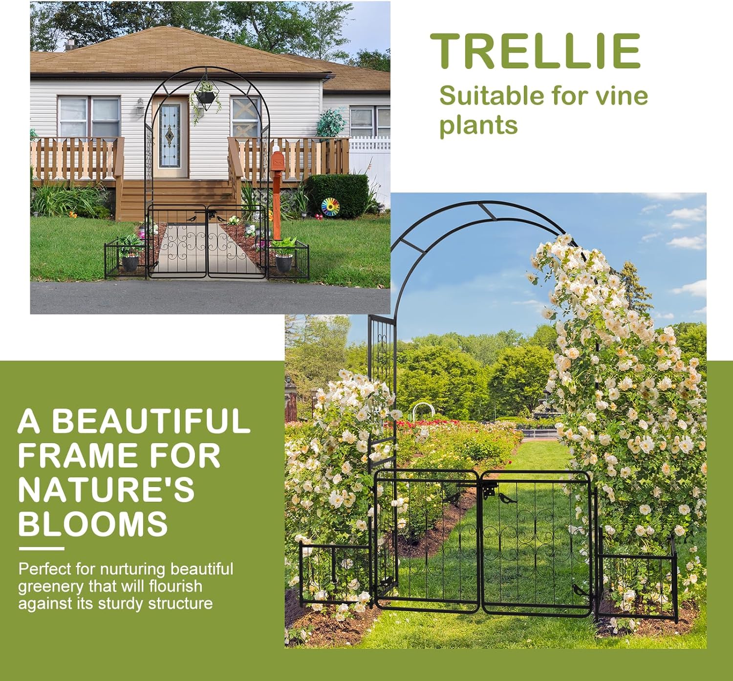 • 【DELICATE APPERANCE】Exquisite workmanship ensures that every corner and surface of the arch is smooth and burr-free. The graceful garden arch create a beautiful entrance to your garden with its delicate lines and vintage apperances. Uniquely styled door with deadbolt serves as entrance to your patio, adding a striking focal point to your yard