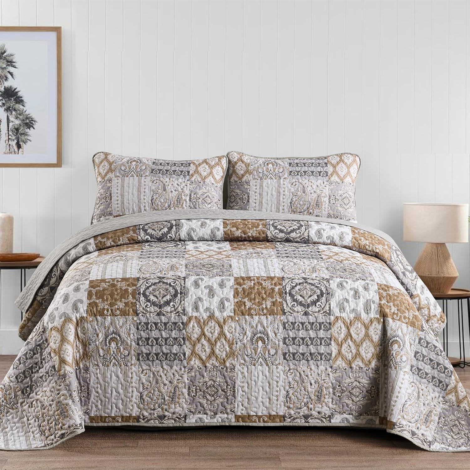 WONGS BEDDING Brown Quilt Set Queen Size, Patchwork Plaid Bedspread Bedding Sets Paisley Soft Microfiber Quilts for Queen Bed 3 Pieces Coverlet Set for All Season (96"x90")