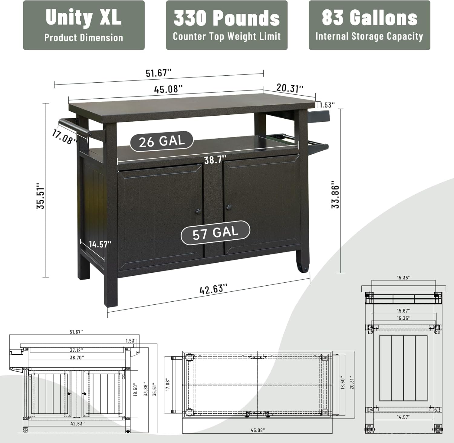 • Ample Storage Spaces- The outdoor dining cart contains 2-tier shelf for more storage. Domi outdoor grill table includes 57 gallons of interior storage & 26 gallons of open storage for a total of 83 gallons of storage capacity.