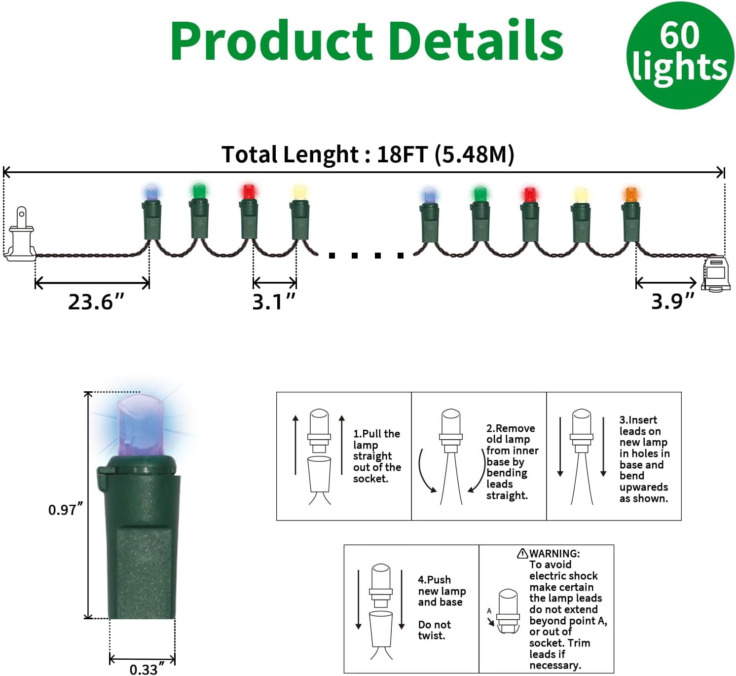 • 5mm LED Christmas Lights: 60 counts Multicolor 5mm wide angle stable LED string lights spaced 3.1 inches apart with green wire. 23.6 inch leads have a stackable male plug and 3.9 inch tails have a female plug for easy end to end connection.