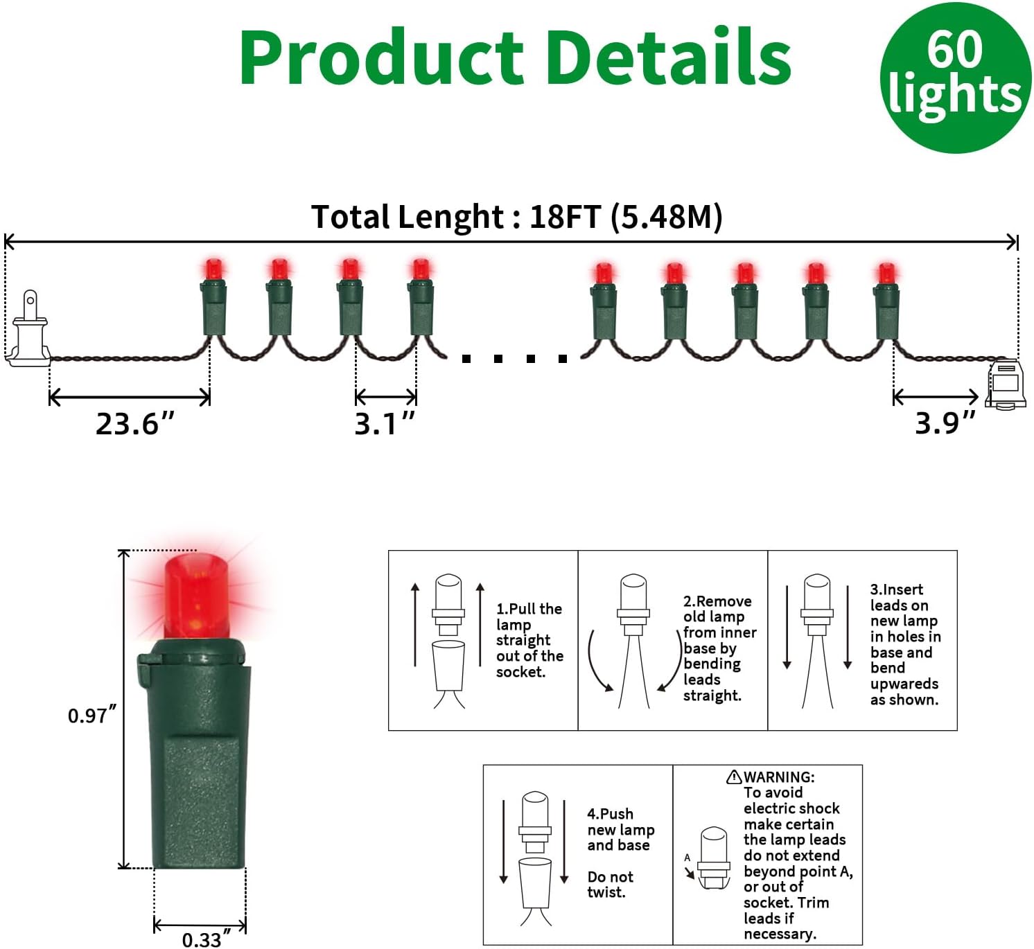 • 5mm LED Christmas Lights: 60 counts Red 5mm wide angle stable LED string lights spaced 3.1 inches apart with green wire. 23.6 inch leads have a stackable male plug and 3.9 inch tails have a female plug for easy end to end connection.