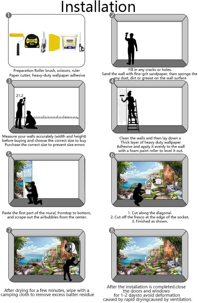 • Installation steps 1. Fill in any cracks or holes and clean the surface of the wall of dust, dirt and grease.2. Apply heavy-duty wallpaper paste to the wall, not the mural.3. Mark the position of each strip of wallpaper with a spirit level.4. Align the pattern and slide it into place.5. Scrape the bubbles with a spatula.6. Let it dry for a couple of minutes and it's ready to go!