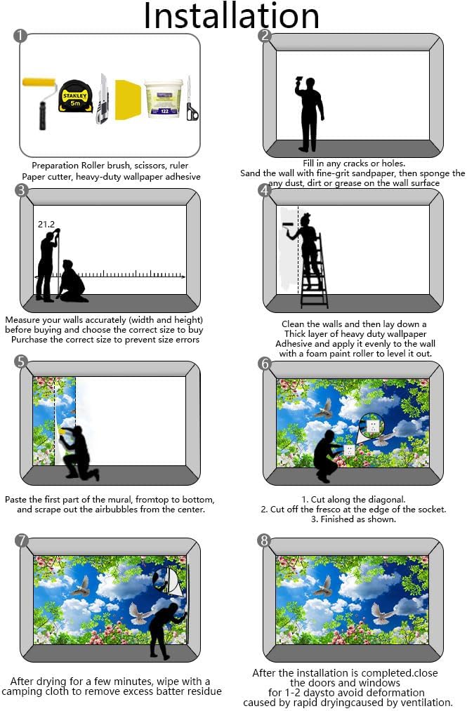 • Installation steps 1. Fill in any cracks or holes and clean the surface of the wall of dust, dirt and grease.2. Apply heavy-duty wallpaper paste to the wall, not the mural.3. Mark the position of each strip of wallpaper with a spirit level.4. Align the pattern and slide it into place.5. Scrape the bubbles with a spatula.6. Let it dry for a couple of minutes and it's ready to go!
