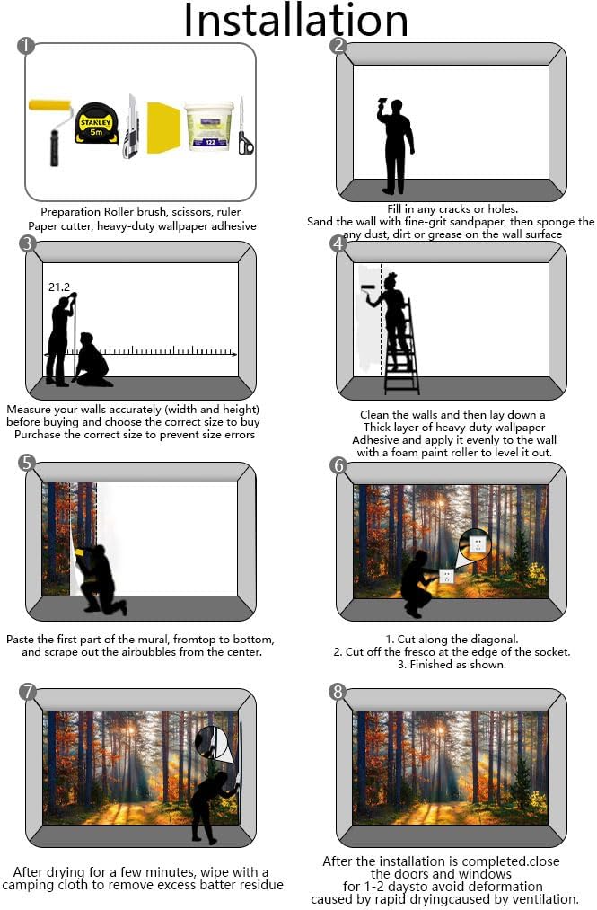 • Installation steps 1. Fill in any cracks or holes and clean the surface of the wall of dust, dirt and grease.2. Apply heavy-duty wallpaper paste to the wall, not the mural.3. Mark the position of each strip of wallpaper with a spirit level.4. Align the pattern and slide it into place.5. Scrape the bubbles with a spatula.6. Let it dry for a couple of minutes and it's ready to go!