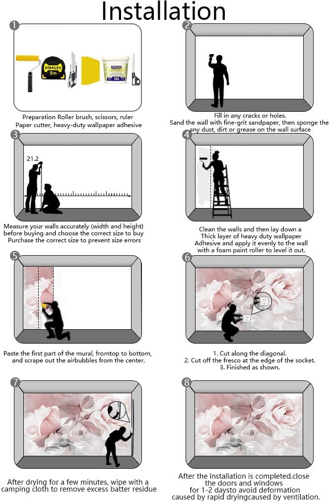 • Installation steps 1. Fill in any cracks or holes and clean the surface of the wall of dust, dirt and grease.2. Apply heavy-duty wallpaper paste to the wall, not the mural.3. Mark the position of each strip of wallpaper with a spirit level.4. Align the pattern and slide it into place.5. Scrape the bubbles with a spatula.6. Let it dry for a couple of minutes and it's ready to go!